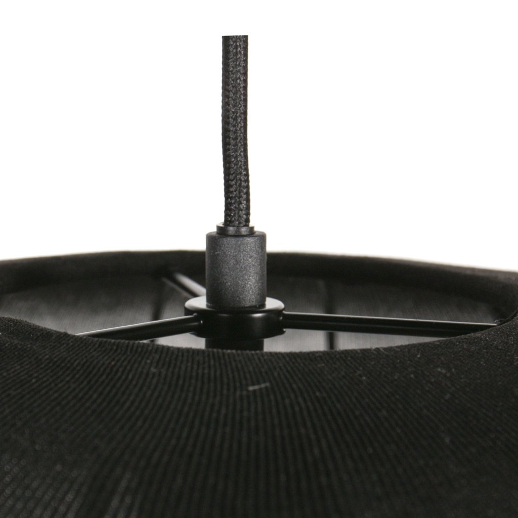 Met zijn royale formaat, zwarte linnen kap en verfijnde uitstraling voegt deze hanglamp een chique, moderne en warme touch toe aan elk interieur.