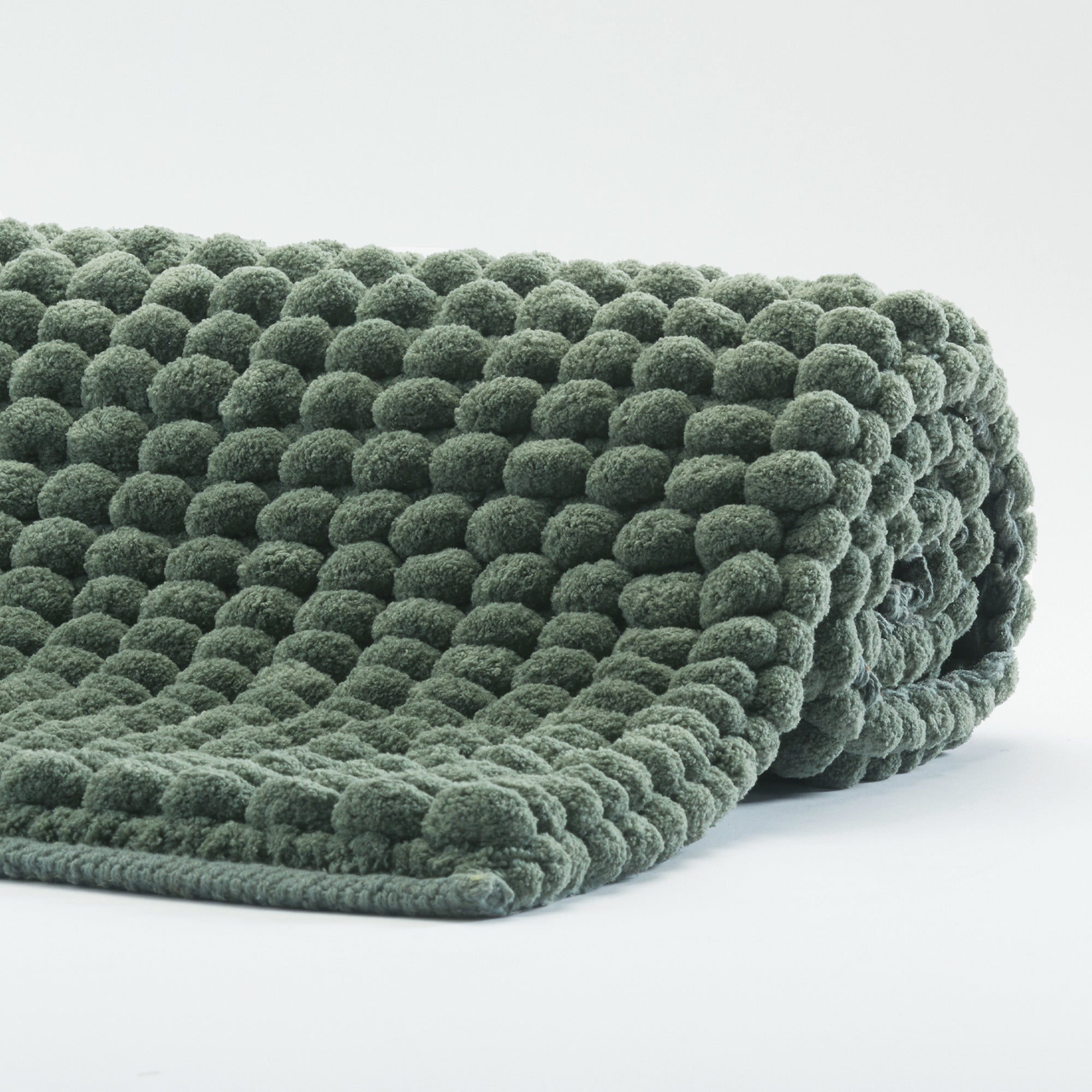- Een handgemaakte mat met grote lussen, gemaakt van een zachte en sneldrogende stof.