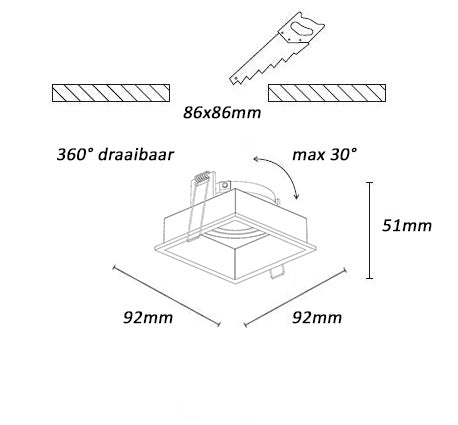 ✔ Afmetingen: 9.2 x 9.2 cm, hoogte 5.1 cm ✔ Zaagmaat: 8,6 cm – past perfect in systeemplafonds en verlaagde plafonds ✔ Kantelbaar tot 30 graden – ideaal om accenten te leggen in je interieur ✔ Sterke bevestigingsveren voor een stabiele en veilige montage