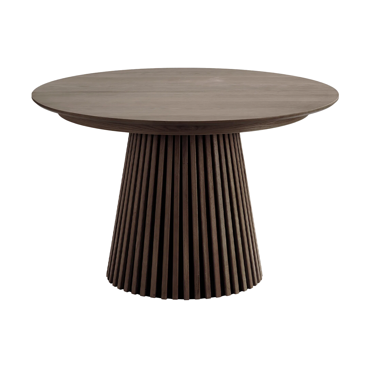 Deze tafel is lekker speels in gebruik: je begint met een ronde tafel van 120 cm en kan hem gemakkelijk uitschuiven tot wel 240 cm! Hoe? Met de drie extra platen van elk 40 cm die je simpelweg in het midden legt – zo blijven de stoere, half ronde poten aan de uiteinden. De tafel is voorzien van een eikenhout fineer laag. Of je nu voor de lichte of donkere kleur kiest, deze tafel voegt altijd een warme, natuurlijke sfeer toe aan je interieur. Plus, de poten zijn een kunstwerk op zich, met verticale houten latjes die de Alko een moderne, minimalistische look geven. Of je nu met z'n tweeën aan de maaltijd zit of je gasten uitnodigt, de Alko past zich helemaal aan jouw behoeftes aan. Perfect voor gezellige etentjes.