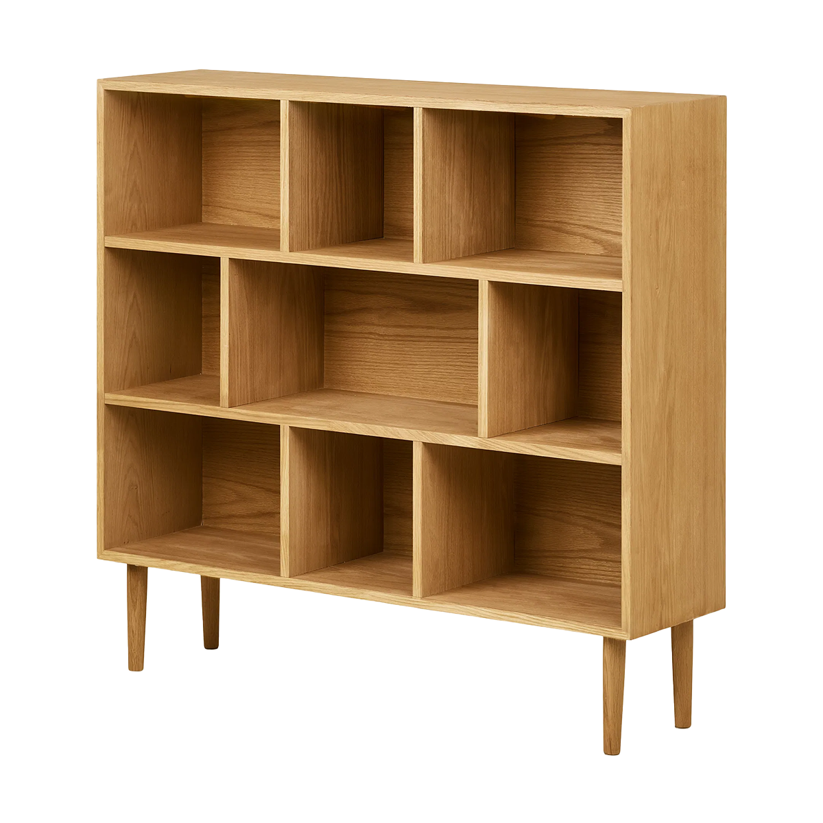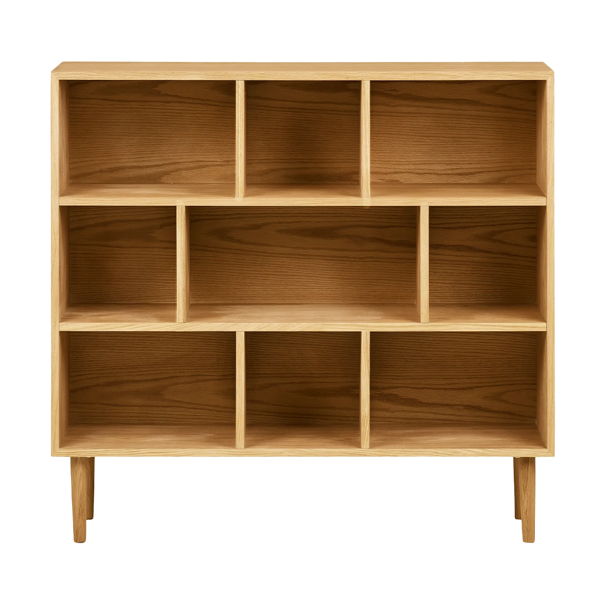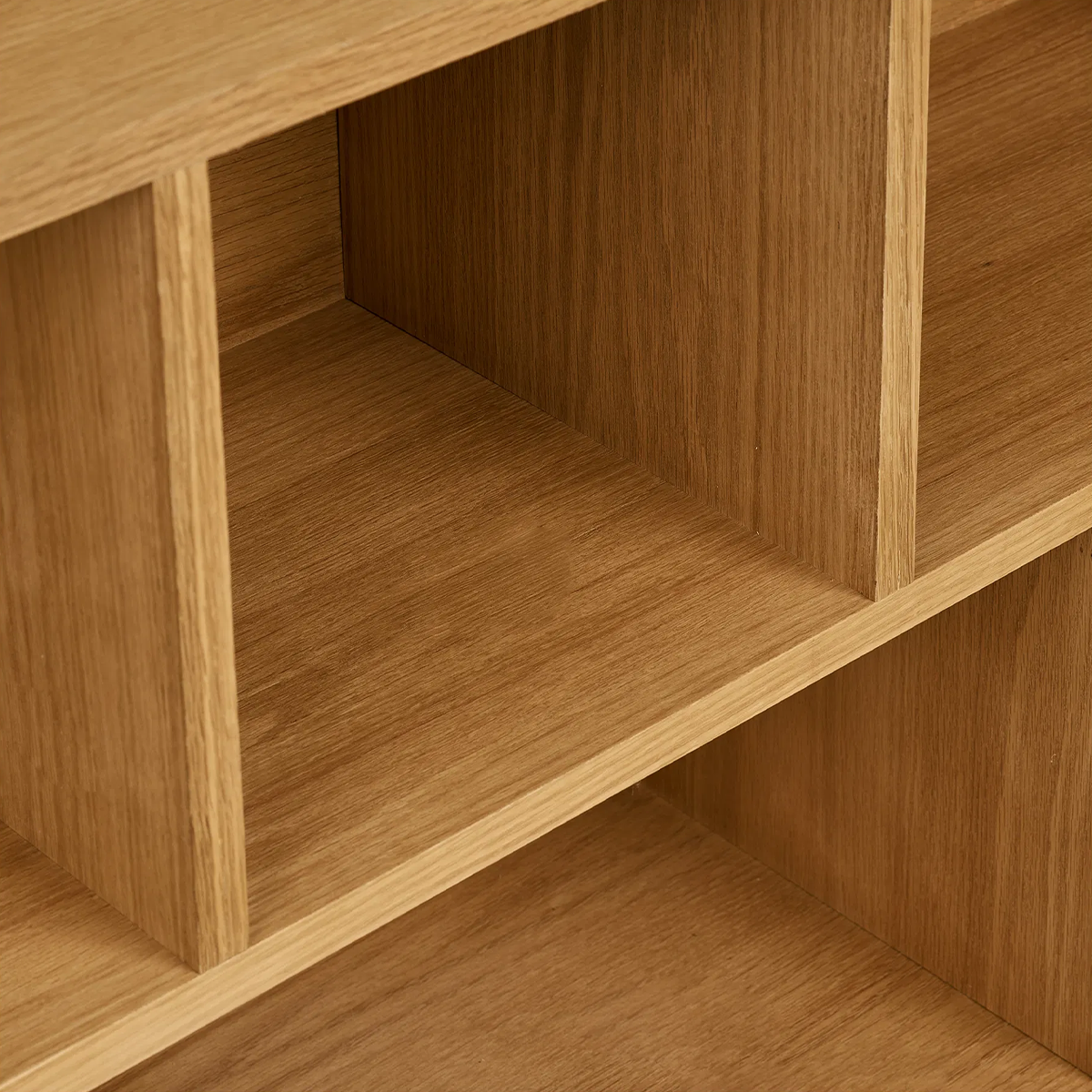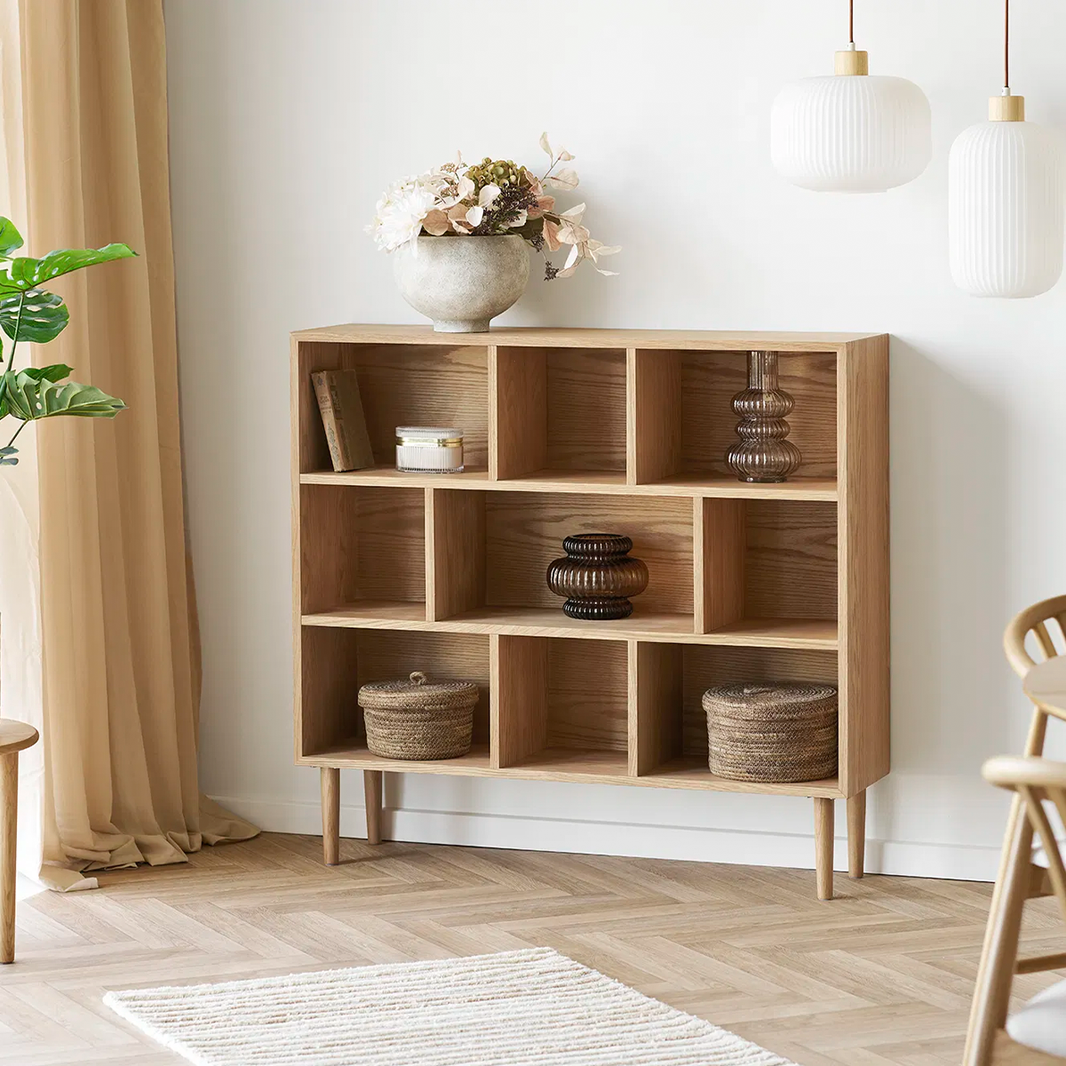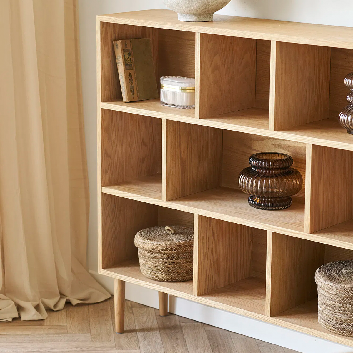De kast is gemaakt van naturel eikenhout en valt op door de 9 open vakken in verschillende groottes. Dat geeft niet alleen een levendig effect, maar maakt het ook extra leuk om je favoriete boeken, planten en decoratie af te wisselen.