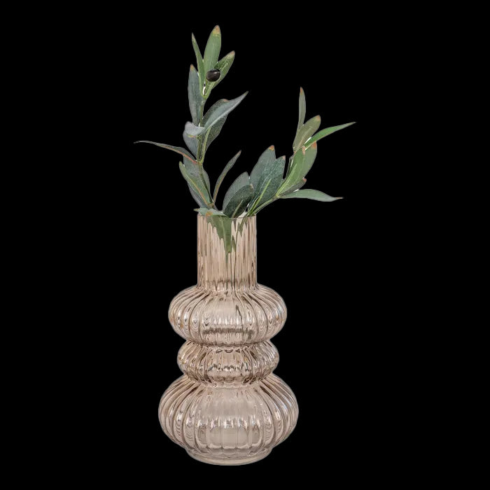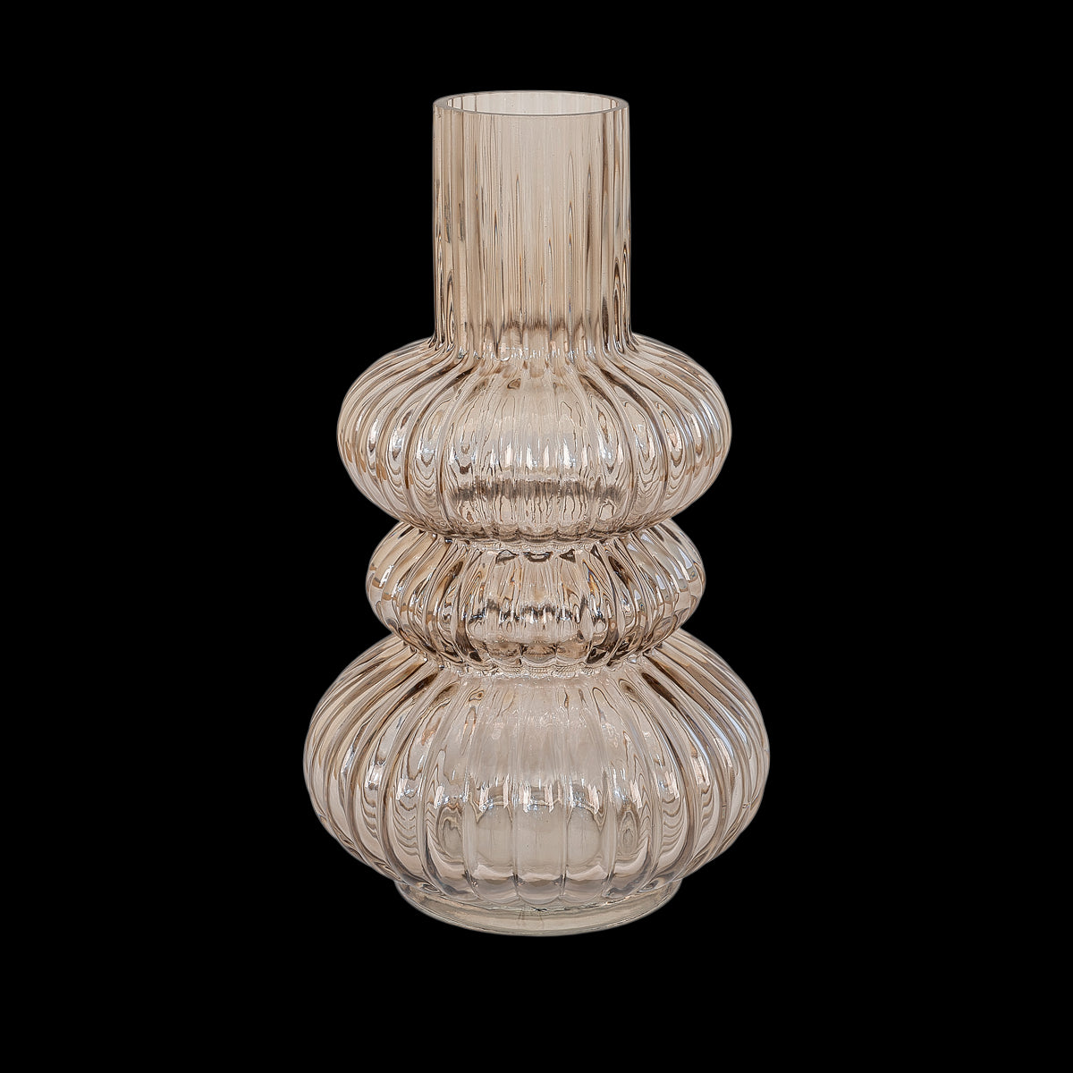 - Glazen vaas met geribbeld oppervlak en bruine kleur
