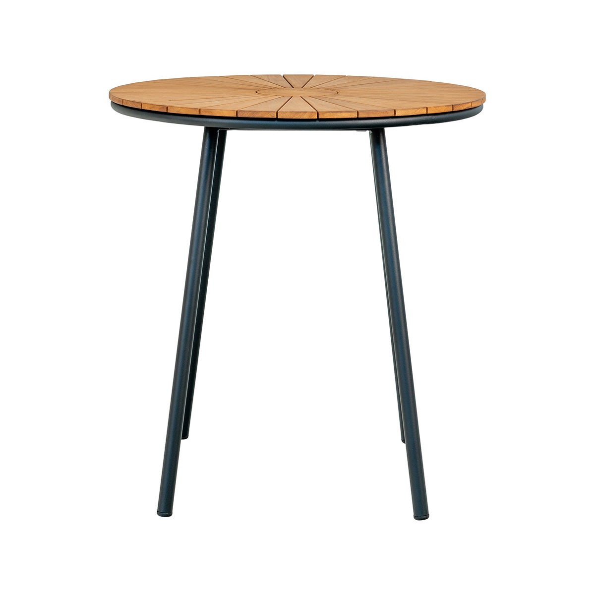 De Matteo tuintafel is rond van vorm en heeft een diameter van 70 cm. Deze leuke café tafel voor in de tuin heeft een metalen frame met vier losse poten en een teakhouten blad. Deze combinatie van deze materialen en kleuren geeft de tuintafel een stoere en industriële uitstraling. Het blad van dit leuke tafeltje is opgebouwd uit losse latjes die in de rondte zijn gelegd, wat een stijlvol patroon van lijnen creëert. Teakhout is bovendien een sterk en duurzaam materiaal dat weinig onderhoud vergt, maar tegelijkertijd een erg warme een natuurlijke uitstraling heeft. De Matteo ronde tuintafel heeft het ideale formaat voor een kleine tuin of een klein balkon. Combineer de bistro tuintafel met een set leuke stoelen en geniet van het heerlijke weer op een zonnige dag.