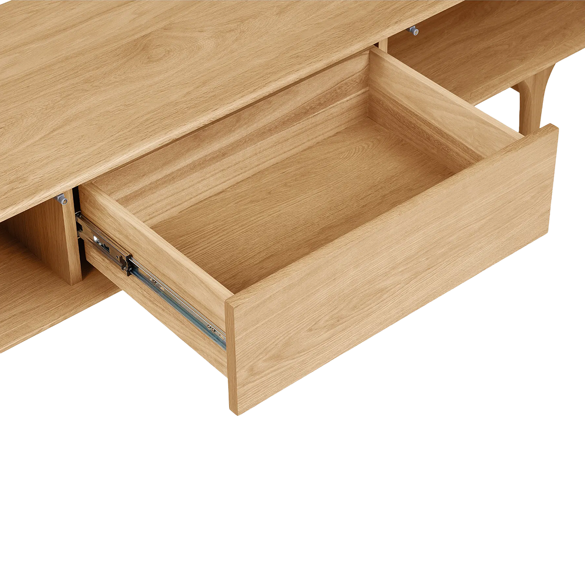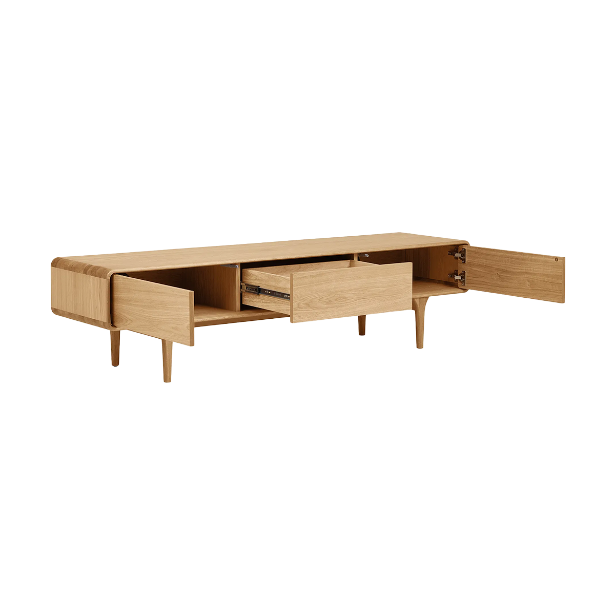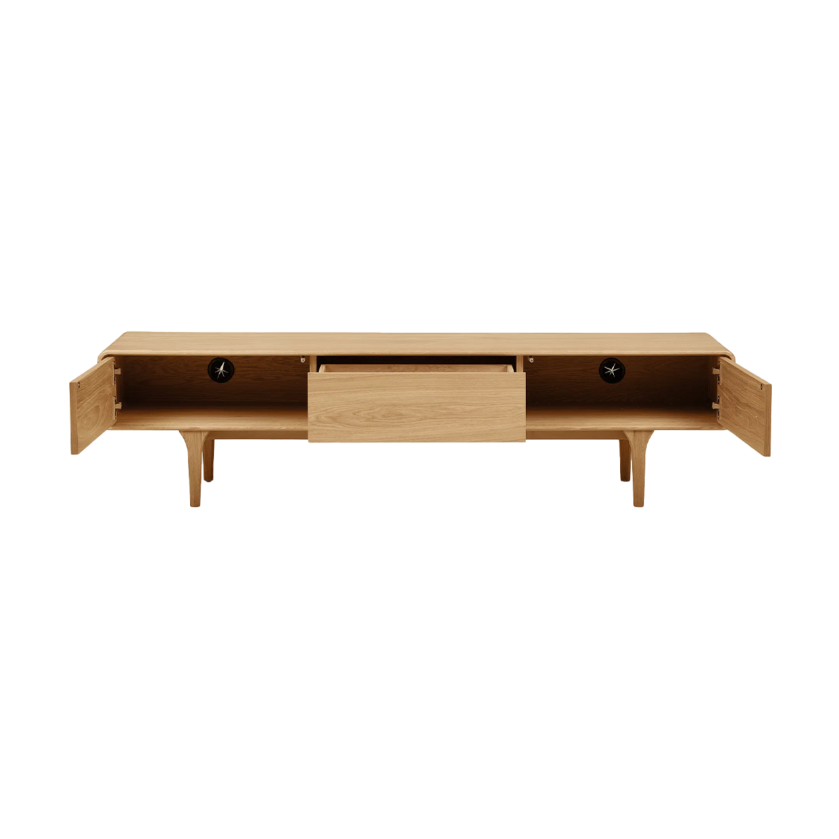Gemaakt van naturel eikenhout straalt dit meubel warmte en rust uit, waardoor het perfect past in Scandinavische en Japandi interieurs. Het tv-meubel is voorzien van één ruime lade in het midden en twee afsluitbare vakken aan weerszijden. Zo berg je eenvoudig alle afstandsbedieningen, kabels en accessoires netjes uit het zicht op. Handig detail: de vakken zijn aan de achterkant uitgerust met een gat voor bedrading, zodat je kabels gemakkelijk en onopvallend wegwerkt. Mels biedt voldoende ruimte voor een grote televisie én decoratieve accessoires zoals vazen, boeken of fotolijstjes.