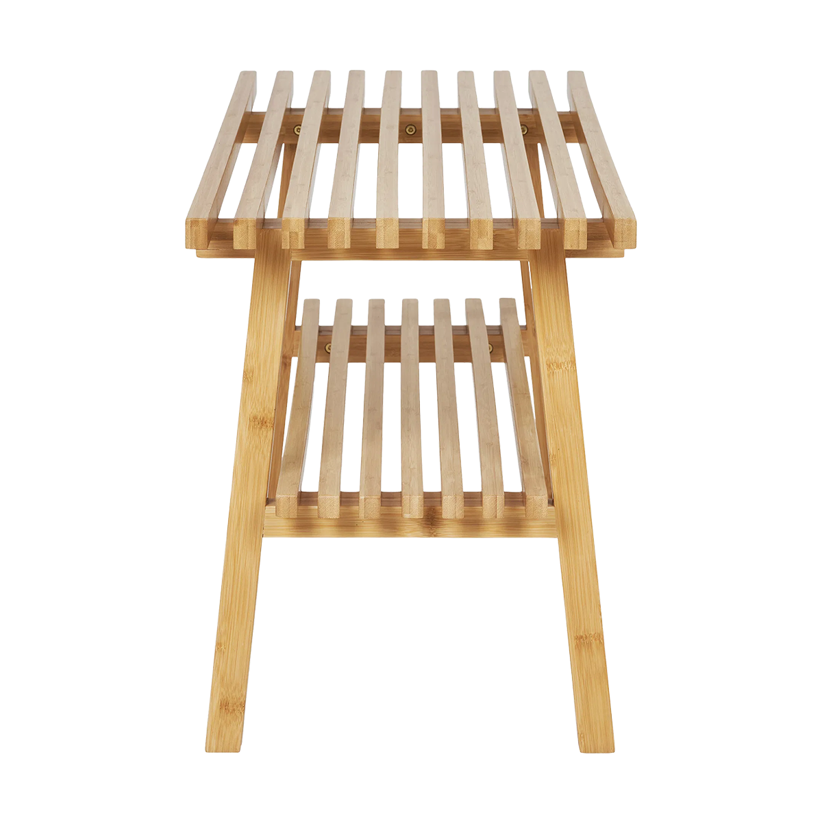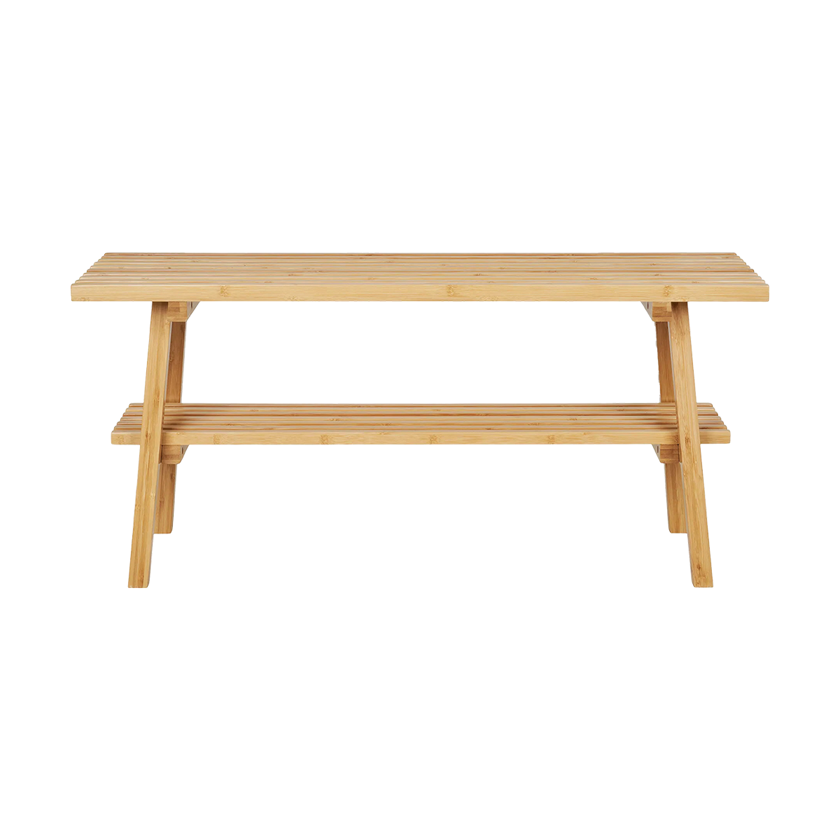 Met een natuurlijke uitstraling dankzij het duurzame bamboemateriaal biedt dit bankje zowel functionaliteit als stijl. Met een breedte van 70 cm, een diepte van 28 cm en een zithoogte van 45 cm is Mike ideaal om te gebruiken bij een eettafel, omdat de zithoogte overeenkomt met die van een gemiddelde eetkamerstoel. Het zitvlak van het bankje bestaat uit meerdere houten latjes met een tussenruimte. Onder het zitvlak bevinden zich extra latjes, perfect om grotere spullen op te bergen, zoals decoratieve manden of schoenen. Een bankje zoals het Mike houten bankje komt altijd wel ergens van pas: voor het aantrekken van je schoenen in de hal, als extra zitplek voor visite, als decoratie voor een lege muur of als ‘kledingstoel’ op de slaapkamer. Dankzij de compacte afmetingen past het kleine bankje in vrijwel elke ruimte.