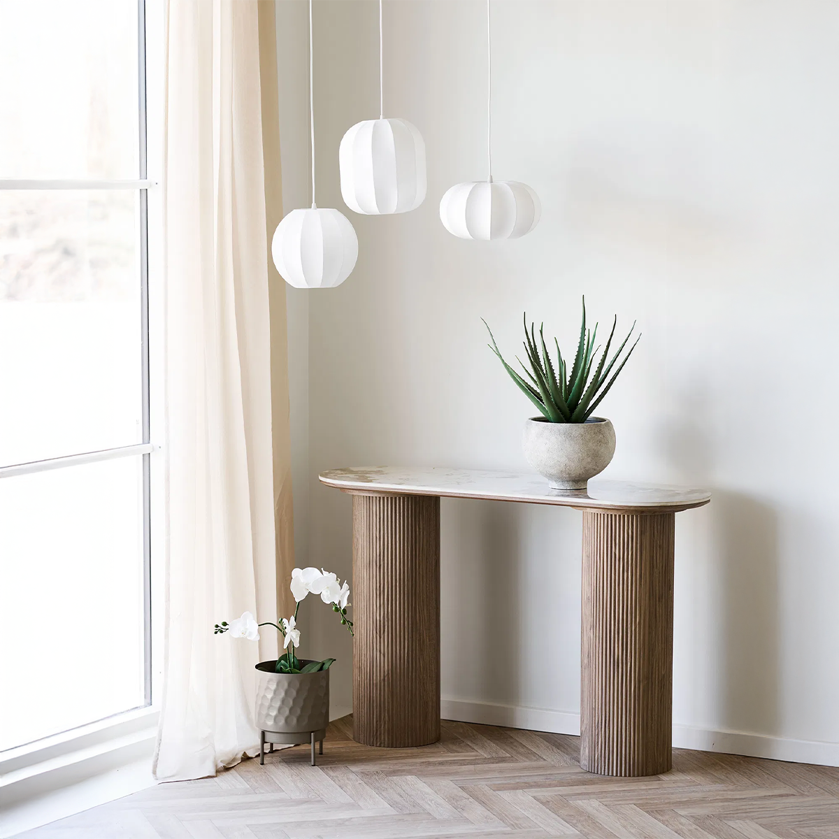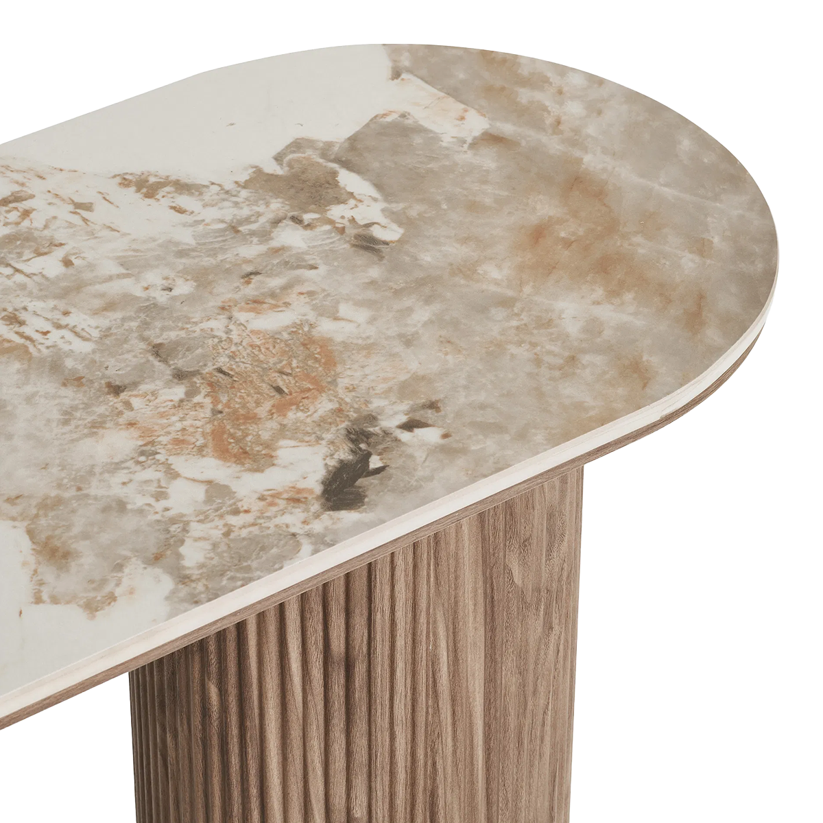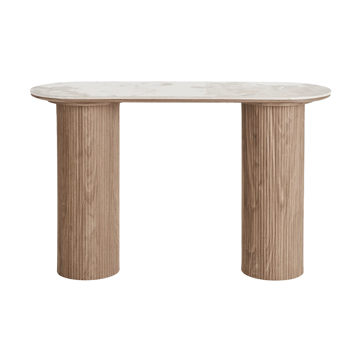 Het warme houten onderstel vormt een mooi contrast met het duurzame keramieken blad in een bruine tint. Deze combinatie zorgt voor een luxe en natuurlijke uitstraling die perfect past in Scandinavische en Japandi interieurs. Dankzij de royale afmetingen van 120 x 78 cm heb je genoeg ruimte om je mooiste accessoires, lampen of planten te presenteren.