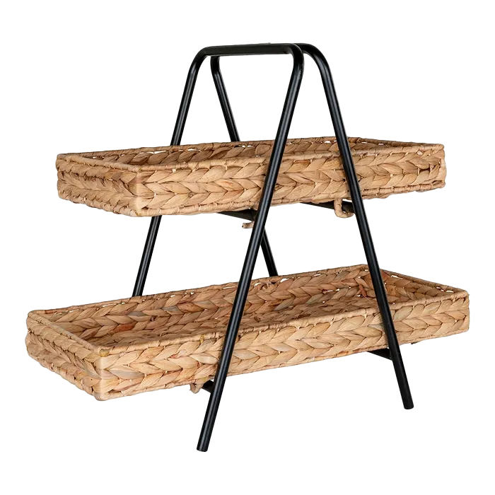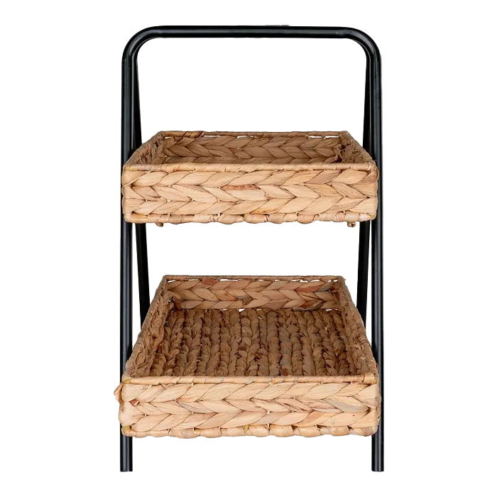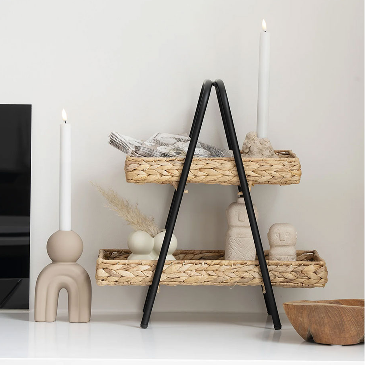 De etagère bestaat uit twee niveaus waarop je allerlei spullen tentoon kan stellen. Combineer bijvoorbeeld een mooie geurkaars en een leuk vaasje, of gebruik hem om servies op te zetten. Het frame is gemaakt van zwart metaal en de twee bladen zijn gemaakt van gevlochten waterhyacint. Deze combinatie van materialen oogt stoer en zorgt voor een spannend contrast. De afmeting van het onderste plateau is 42 cm lang bij 23 cm breed. De etagère is in totaal 43,5 cm hoog.