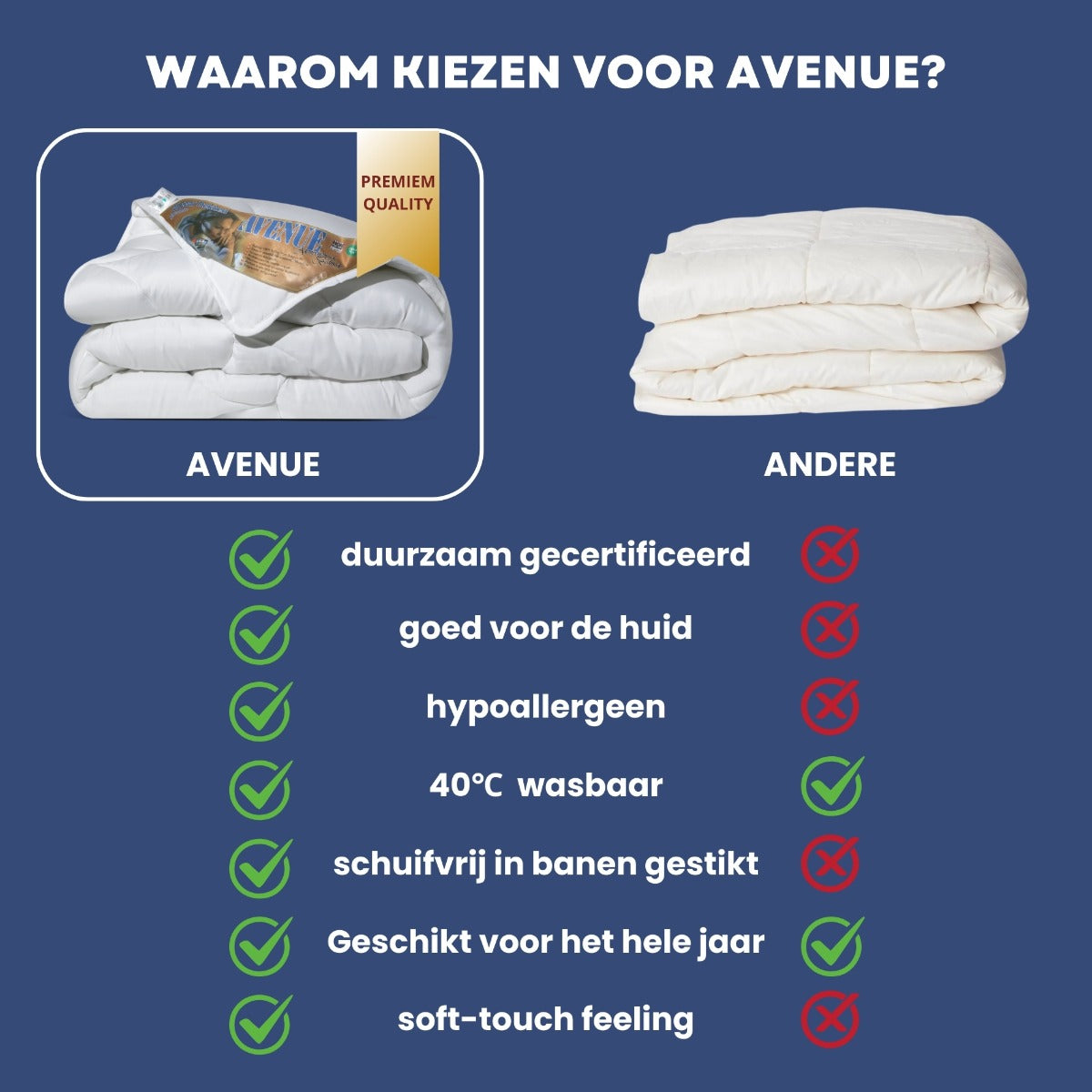 Bij Avenue draait alles om jouw nachtrust. Met ons All-Year dekbed kies je voor een dekbed dat moeiteloos met elk seizoen meebeweegt, zodat jij elke nacht comfortabel en ontspannen kunt slapen. Dit dekbed biedt een ideale balans tussen ademend vermogen en isolatie, zodat je het hele jaar door geniet van de perfecte slaaptemperatuur. Gemaakt van hoogwaardige, hypoallergene materialen is dit dekbed niet alleen zacht en licht, maar ook vriendelijk voor mensen met allergieën.