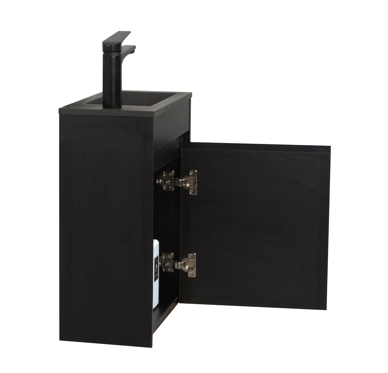 Toiletmeubel Sinta inclusief onderkast en zwarte wastafel. Dit fonteinmeubel is zeer geschikt voor zowel kleine als grotere toiletruimtes en is bedoeld om extra ruimte te creëren. De wastafelkast is gemonteerd en heeft een naar rechts draaiende deur. Deze draairichting kan niet worden aangepast. De wastafel kan wel in de gewenste richting geplaatst worden. Een afvoer kan enkel via de muurzijde van de wastafelkast worden gemonteerd omdat de onderkant vast de wastafelkast dicht is. Toiletmeubel Sinta is met soft-close sluiting afgesteld en wordt geleverd inclusief bevestigingsmateriaal, maar zonder kraan, afvoerplug of sifon. Kenmerken - Compleet toiletmeubel met wastafelkast met witte wastafel. - Veel bergruimte in de wastafelkast - De wastafel wordt geleverd met overloop - Gemonteerd in de verpakking - Inclusief montagemateriaal - Gemaakt van hoogwaardige kwaliteit MDF met fineerlaag - Afgesteld met soft-close sluiting Verpakkingsinhoud - Wastafelkast - Wastafel - Bevestigingsmateriaal - Handleiding Afmetingen en aanvullende informatie - Onderkast met wastafel: 40 x 22 x 54cm Wastafelkast Sinta - Gemaakt van MDF, afgewerkt met fineerlaag - Uitgevoerd met één draaideur - Geïntegreerd handvat - Gesloten onderkant - Open achterzijde Wastafel Sinta - Gemaakt van kunstmarmer - Voorgeboord afvoergat en kraangat