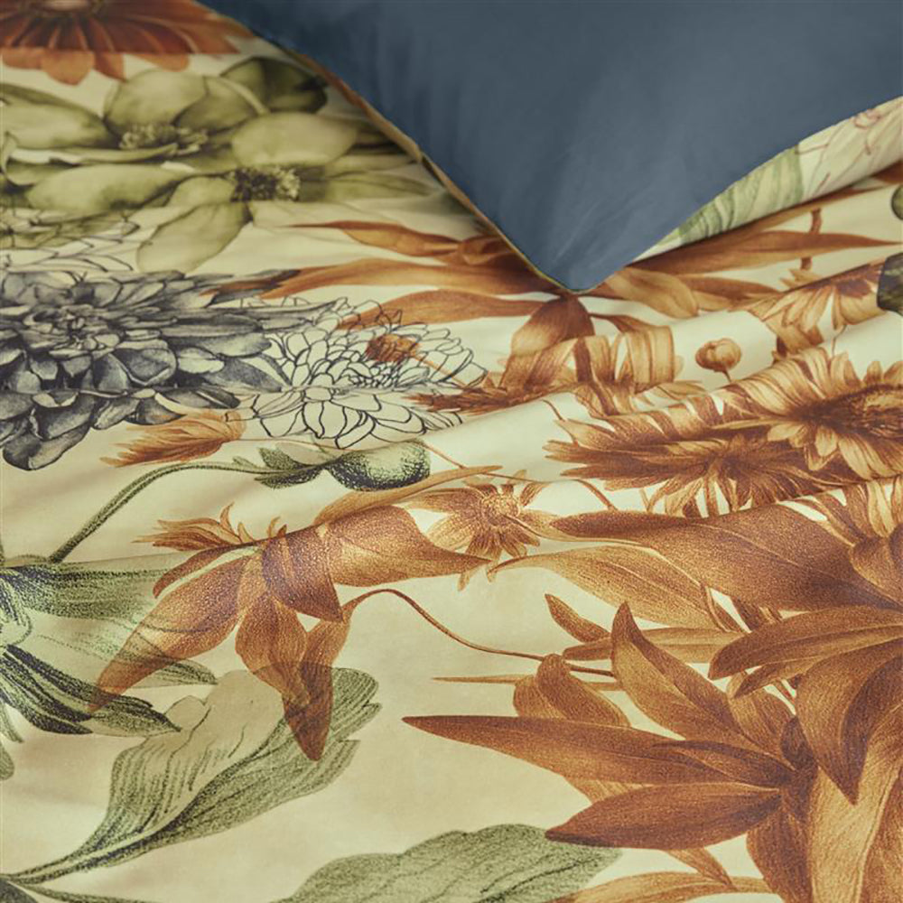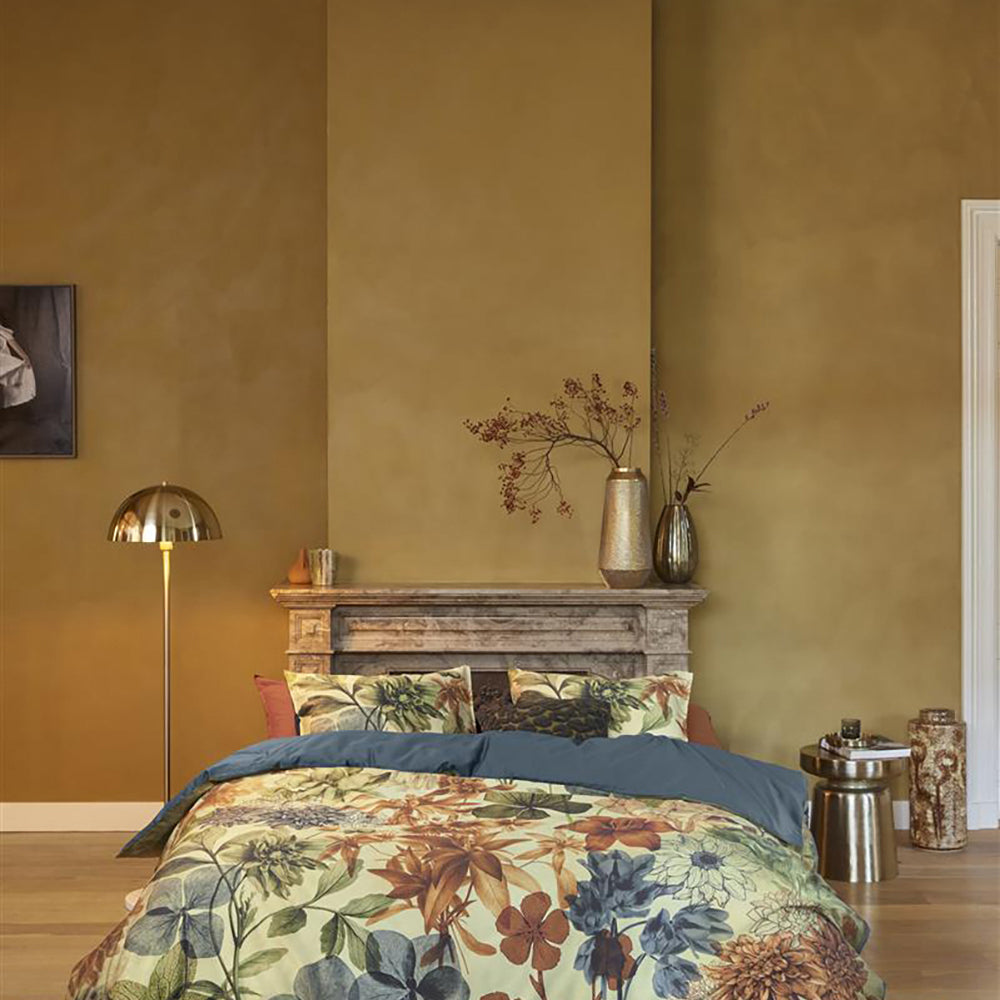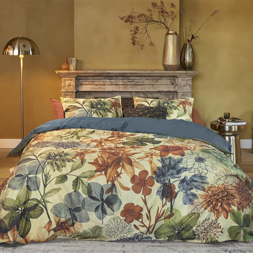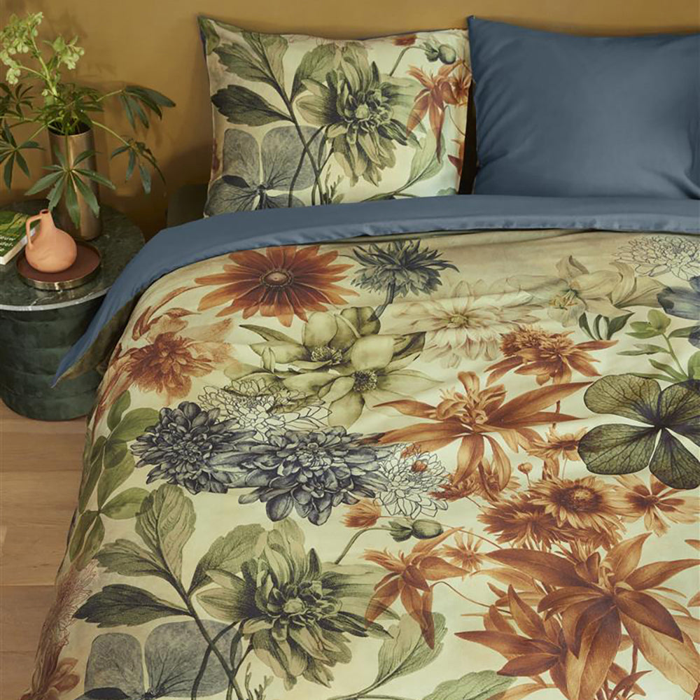 Dekbedovertrek Florian van Beddinghouse heeft een prachtige print van verschillende sfeervolle bloemen. Dahlia’s, hortensia’s en lelies sieren het overtrek in warme herfsttinten op een zachte aquarel ondergrond. De achterzijde van het overtrek heeft een effen blauwgrijze kleur. Het overtrek heeft een chique glans door de satijnweving.