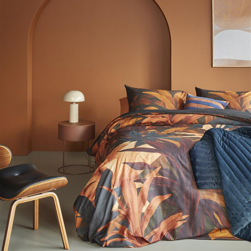 Speel in op de botanische trend met dekbedovertrek Keano van Beddinghouse. Het overtrek bestaat uit een print van grote bladeren die over elkaar heen zijn geplaatst. Door de gelaagdheid en de kleurencombinatie van rood- en blauwtinten geeft dit dekbedovertrek je slaapkamer een warme uitstraling. De achterzijde van het overtrek heeft een effen donkerblauwe kleur.