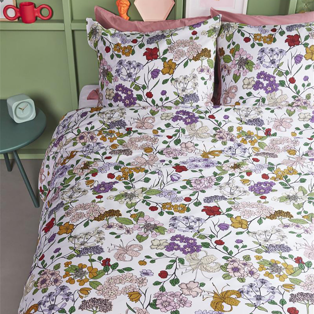 Waarom dekbedovertrek Primrose? Het overtrek Primrose bestaat uit een all-over bloemendessin. De bloemen zijn handgetekend en in diverse vrolijke kleuren afgebeeld op een witte ondergrond. De bloemen die je terug ziet op het overtrek zijn primula, verbena en lelies in zomerse kleuren.