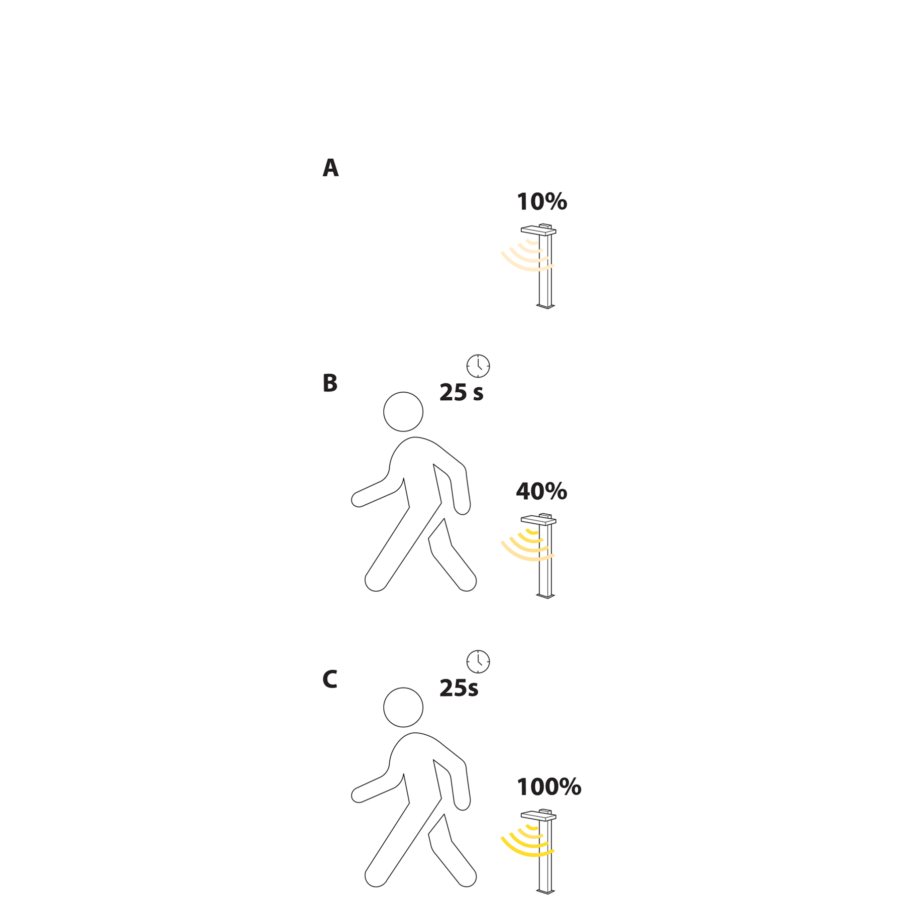 - De bewegingssensor schakelt de lamp in, met 3 helderheidsstanden