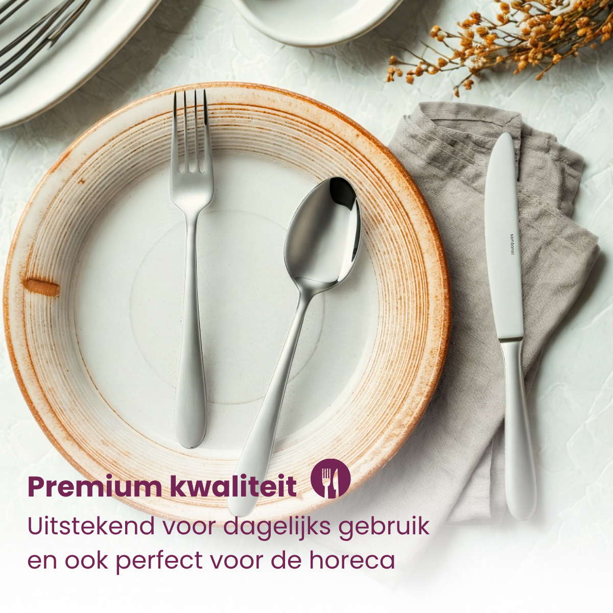Deze prachtige bestekset bestaat uit: 6 messen 6 vorken 6 lepels 6 koffielepels Het bestekset heeft een prachtig design en is passend op iedere gedekte tafel! Dit bestek mag mee in de vaatwasser maar dit raden wij af. De agressieve bestandsdelen in het vaatwasblokje kunnen het bestek aantasten wat ontzettend zonde is. Dit is echt een bestek om jaren van en mee te genieten!