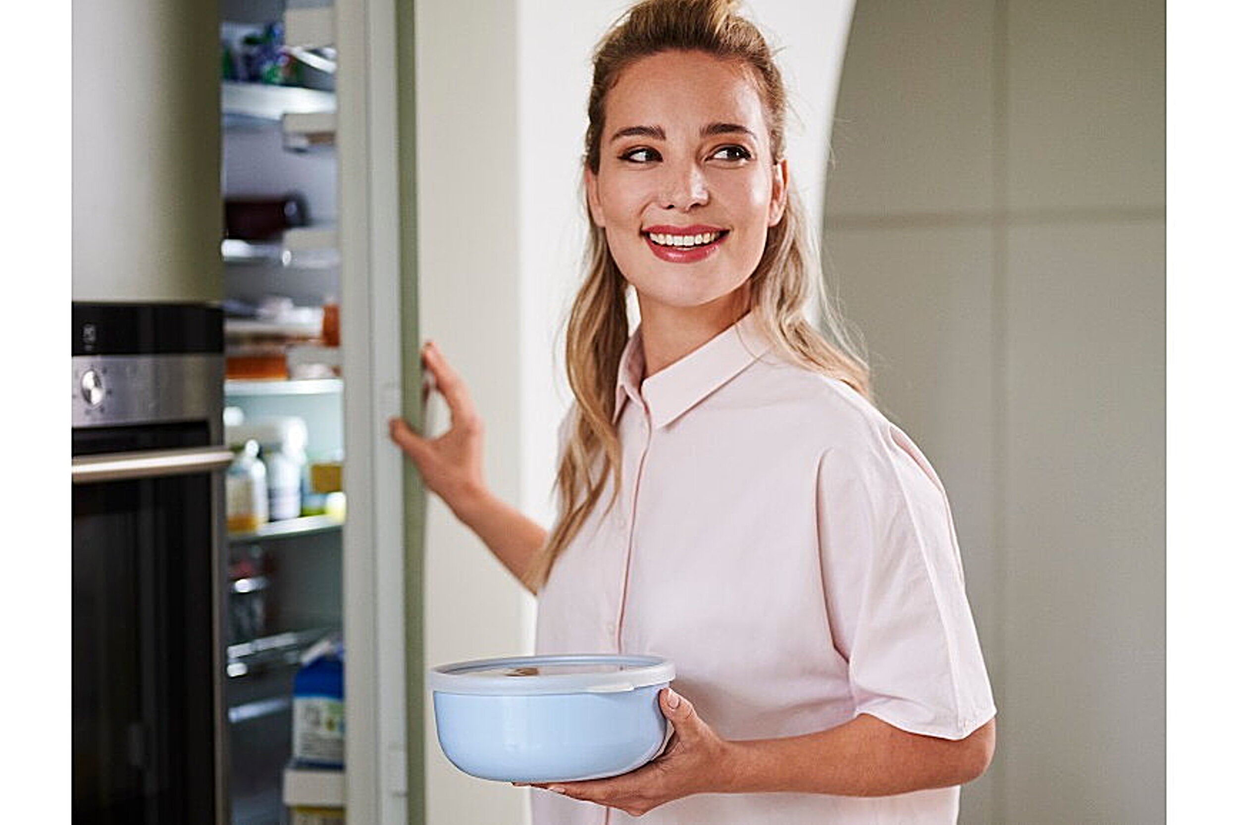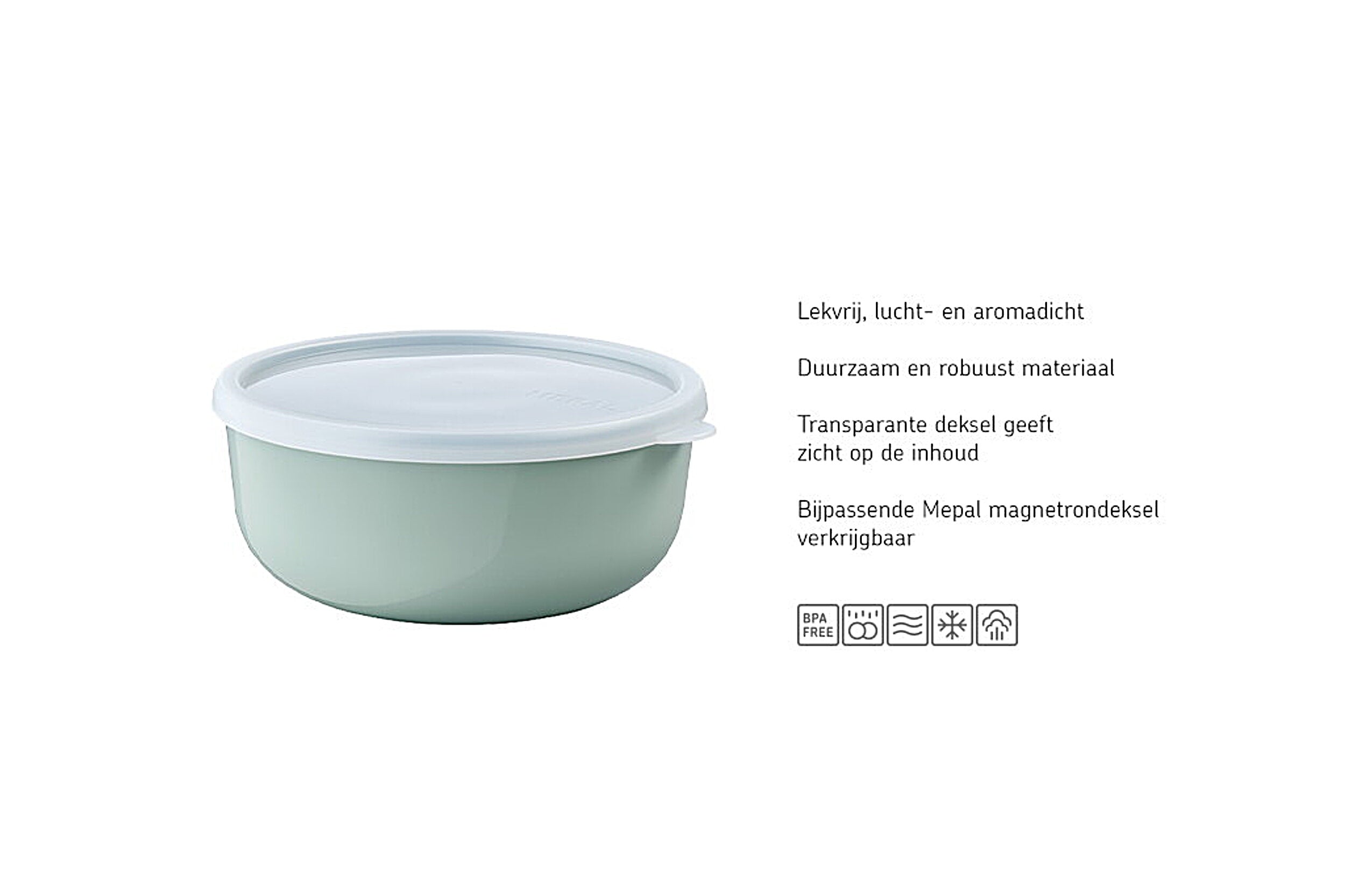 Bewaardoos Lumina 750 ml in Nordic sage. Het perfecte formaat voor het serveren van een frisse salade of het bewaren van het overgebleven stukje quiche en de allerlekkerste zelfgebakken koekjes. De Lumina bewaardoos mag in de koelkast, vriezer, vaatwasser, stoomoven en magnetron (laatste twee zonder deksel). Wist je dat Mepal een ronde magnetrondeksel heeft, die perfect is voor op de schaal in de magnetron. Zo voorkom je dat je gerechten uitdrogen en warm je alles spatvrij op. De elegante en stevige dozen zijn lekvrij, lucht- en aromadicht en gemaakt van robuust materiaal. De handige doorzichtige deksel biedt je direct zicht op de inhoud en met het praktische lipje is ze moeiteloos te openen. De bewaardozen laten zich uitstekend combineren en dankzij hun heldere kleuren en elegante design passen ze bij ieder servies.