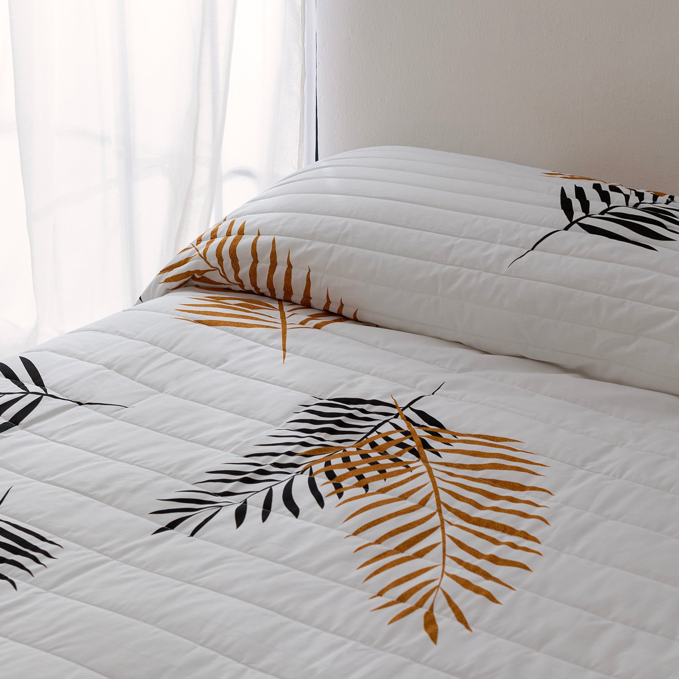 Versier je kamer met het elegante en organische ontwerp van de Foliage sprei uit de Blanc collectie. De verspreide zwarte en mosterdbladeren brengen de beste organische elegantie van het seizoen naar je huis. Ervaar uitzonderlijk comfort en zachtheid onder dit 150 thread count doorgestikte 100% katoenen dekbed met een gladde afwerking. Ideaal voor seizoenswisselingen.