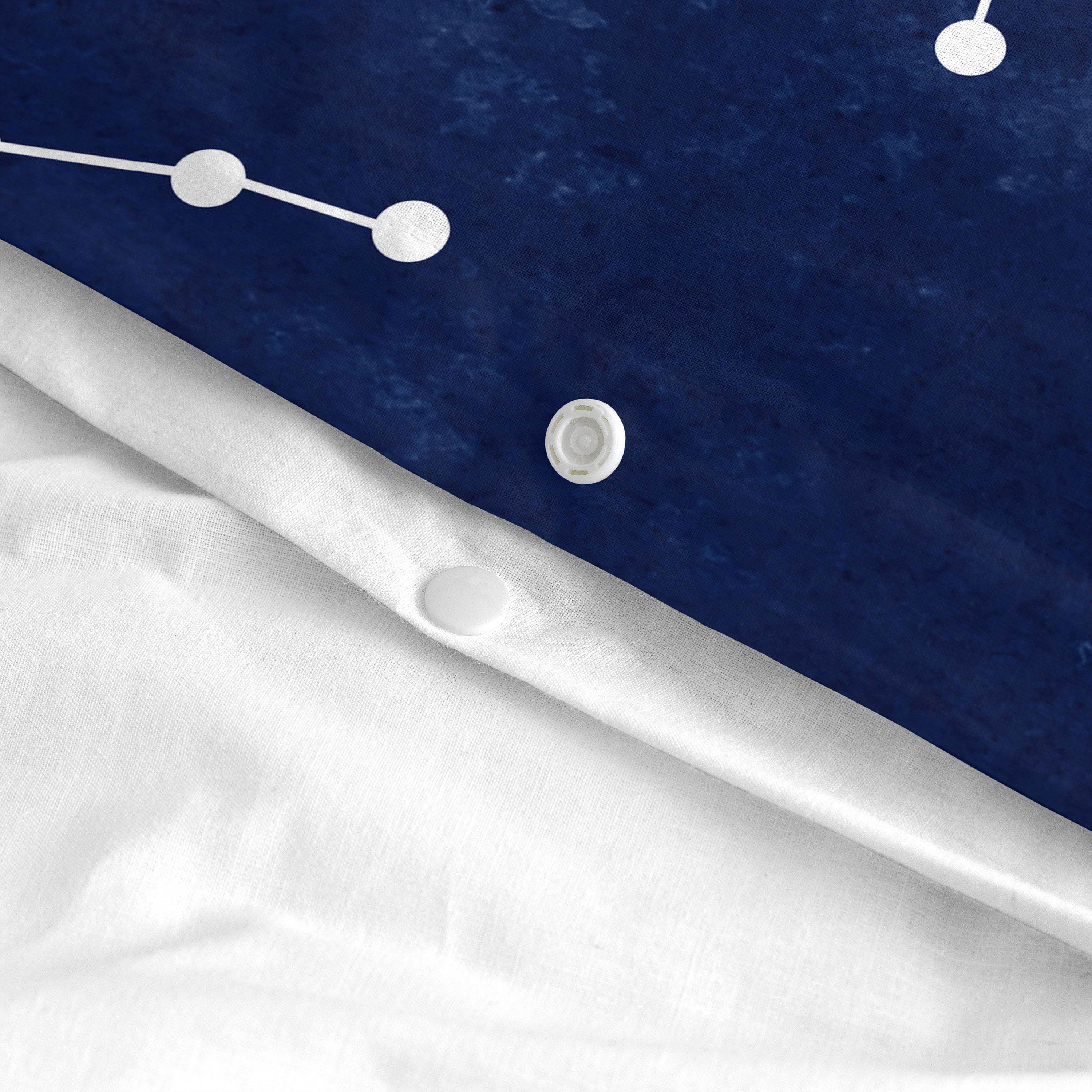 Het vrolijke maar verfijnde Cosmos dekbedovertrek uit de Blanc collectie voert je mee door sterrenbeelden en melkwegstelsels als je elke nacht wegzakt in het diepe, troostende middernachtblauw. Dit zachte en duurzame product is gemaakt in Spanje van 100% katoen en 150 thread count. Handige plastic klittenbandsluitingen maken het makkelijk om je dekbedovertrek te verwisselen op wasdag. Kussensloop en hoeslaken niet inbegrepen.