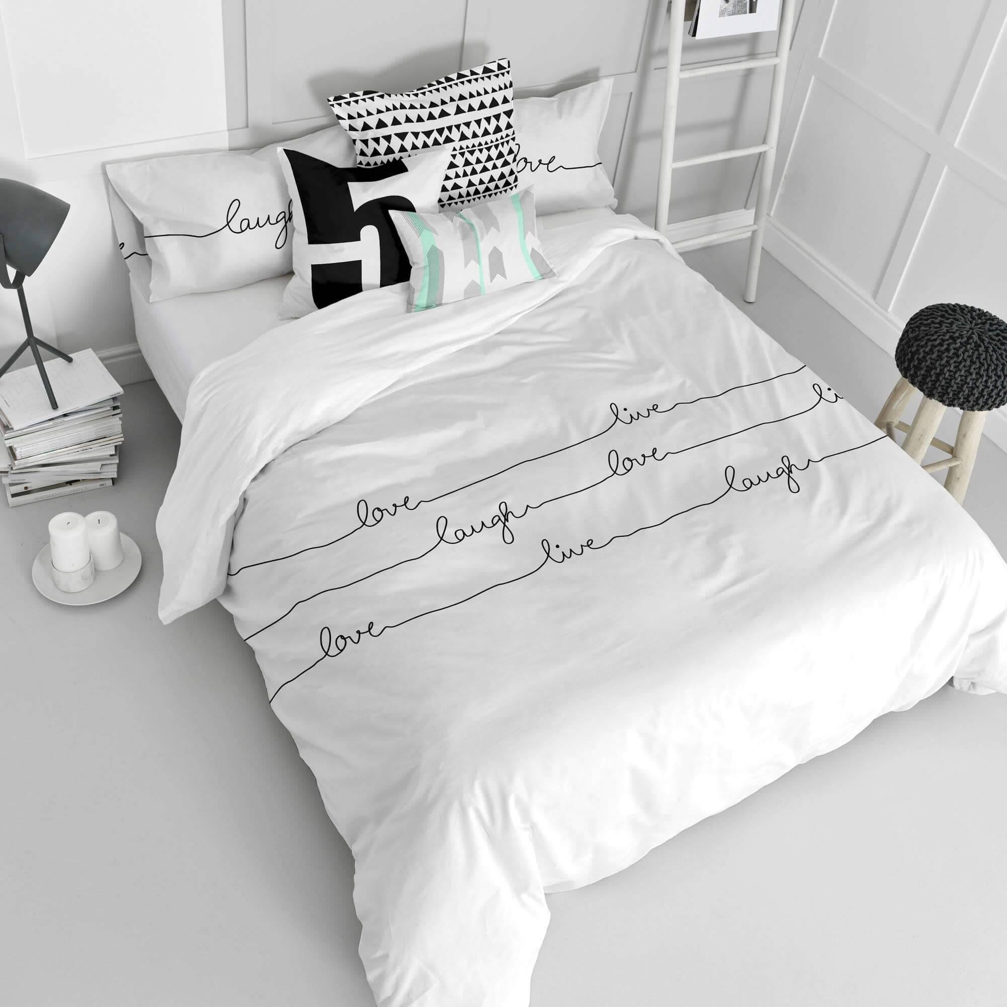 Lees tussen de regels door met het motiverende Live dekbedovertrek uit de Blanc collectie en leef elke dag ten volle, heb lief met heel je hart en lach alsof niemand luistert. Dit 150 thread count 100% katoenen product biedt een zachte, lichte en troostende touch. Handig en gemakkelijk te verwisselen dankzij de plastic klittenbandsluiting. Kussensloop en hoeslaken niet inbegrepen.