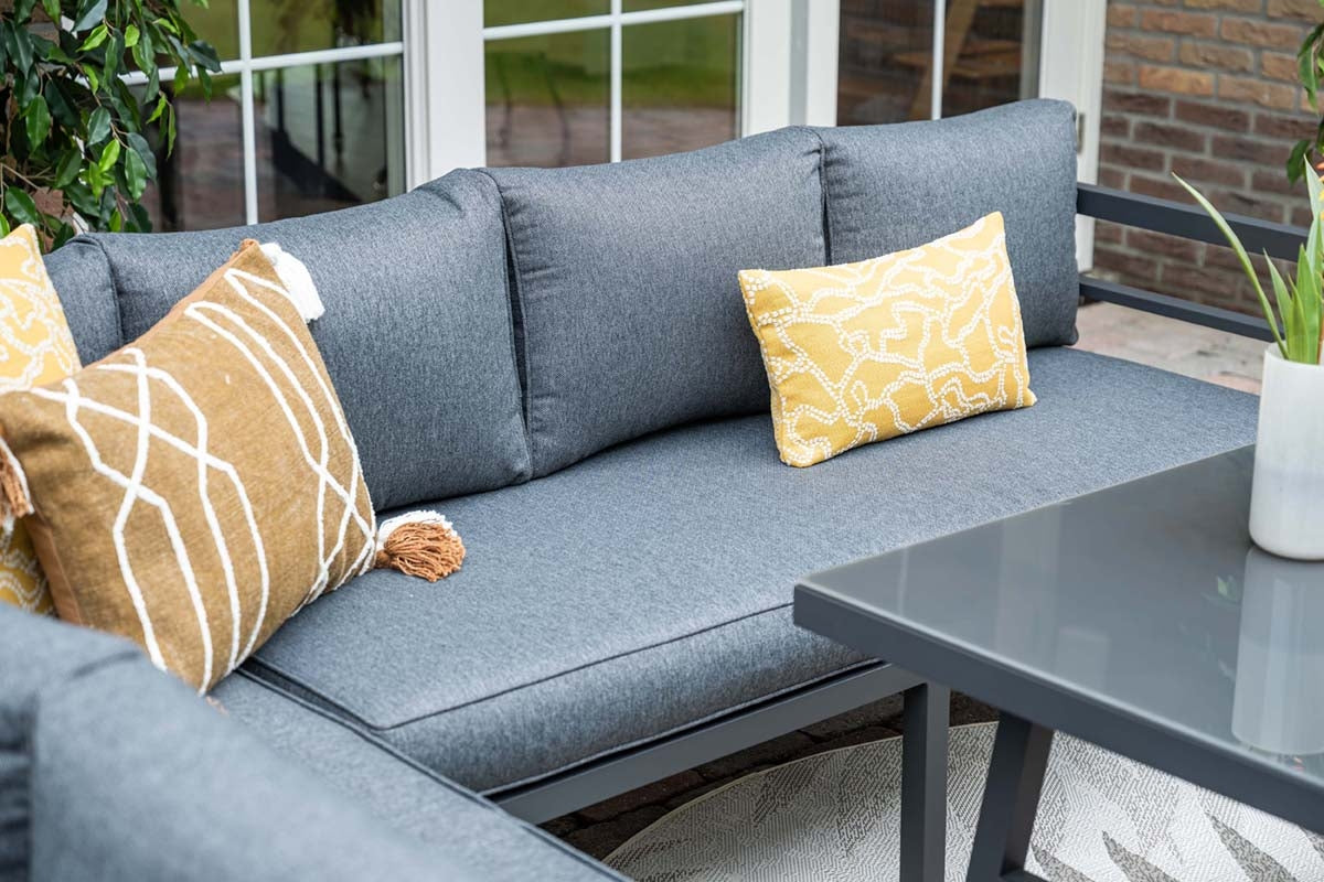 De Bleco set is gemaakt van onderhoudsvrij aluminium. Het tafelblad is gemaakt van veiligheidsglas, wat makkelijk schoon te maken is met een sopje. De kussens zijn waterafstotend: enkele regendruppels kunnen er zo weer afgeklopt worden. Als er slecht weer wordt voorspeld, adviseren wij wel om de kussens droog op te bergen.