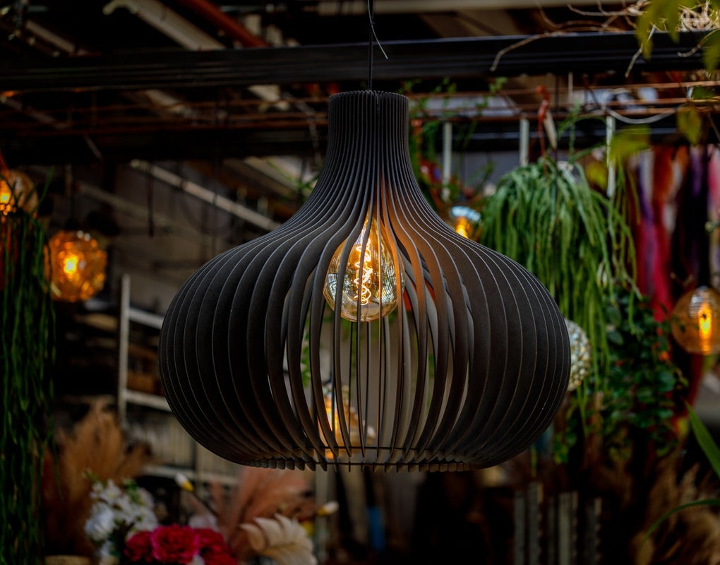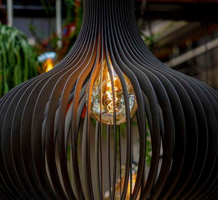 Deze Seattle hanglamp is handmade in Nederland! De MDF houten lamellen worden zorgvuldig met een laser uitgesneden en vervolgens met alle zorg in elkaar gezet. Deze plafonniere is uitgevoerd met houten lamellen die 22,5° gekanteld in het frame zijn gemonteerd, dit geeft de lamp nog meer een trendy uitstraling.
