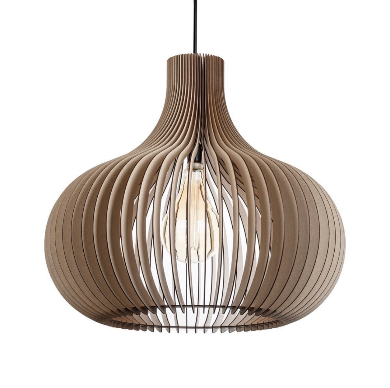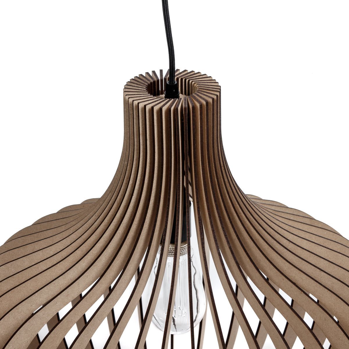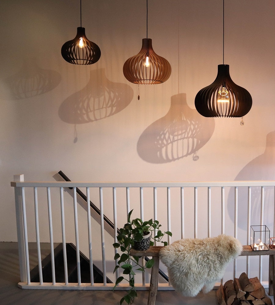 Deze Seattle hanglamp is handmade in Nederland! De MDF houten lamellen worden zorgvuldig met een laser uitgesneden en vervolgens met alle zorg in elkaar gezet. Deze plafonniere is uitgevoerd met houten lamellen die 22,5° gekanteld in het frame zijn gemonteerd, dit geeft de lamp nog meer een trendy uitstraling.
