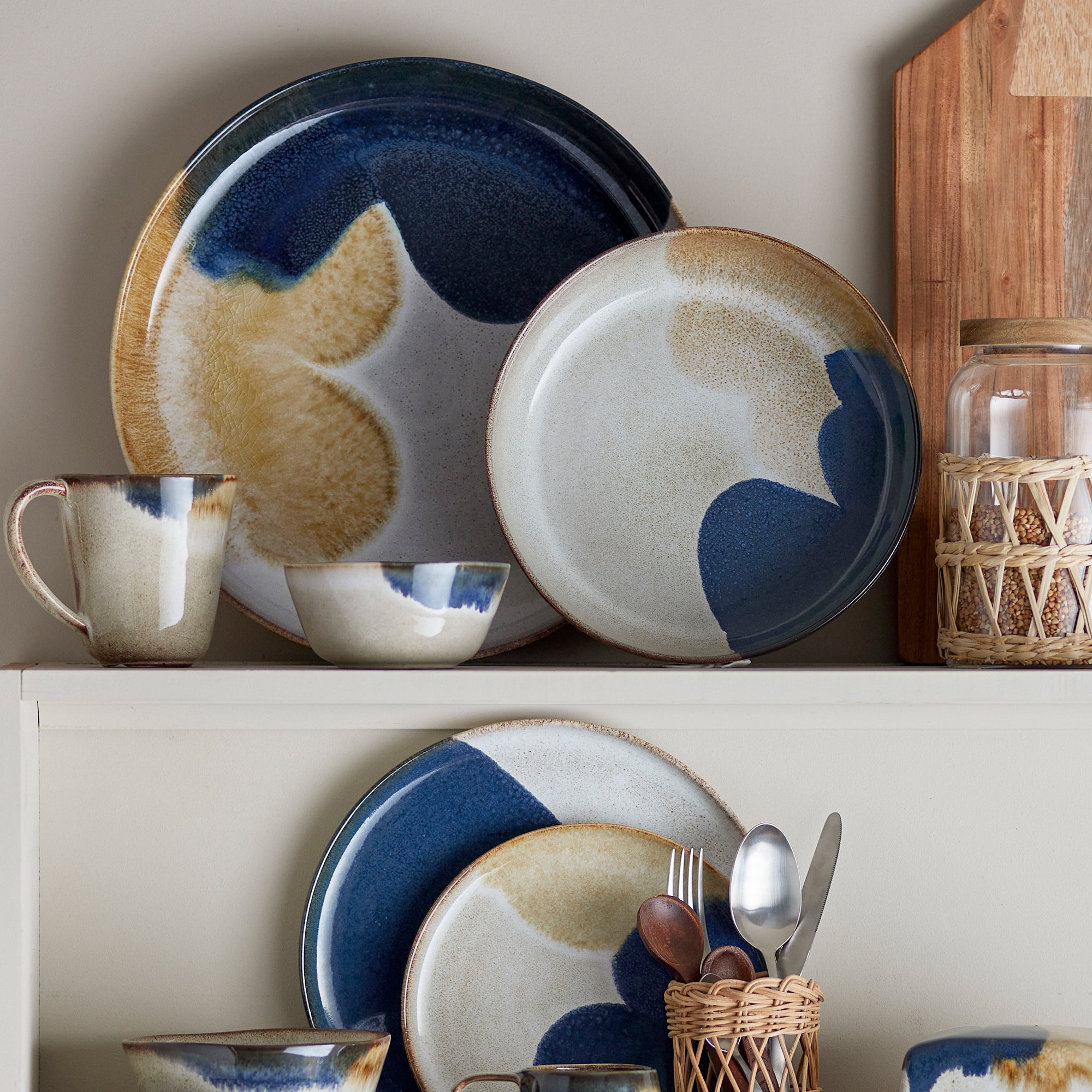 - Warme kleurenmix van blauw, goudbruin en zandtinten