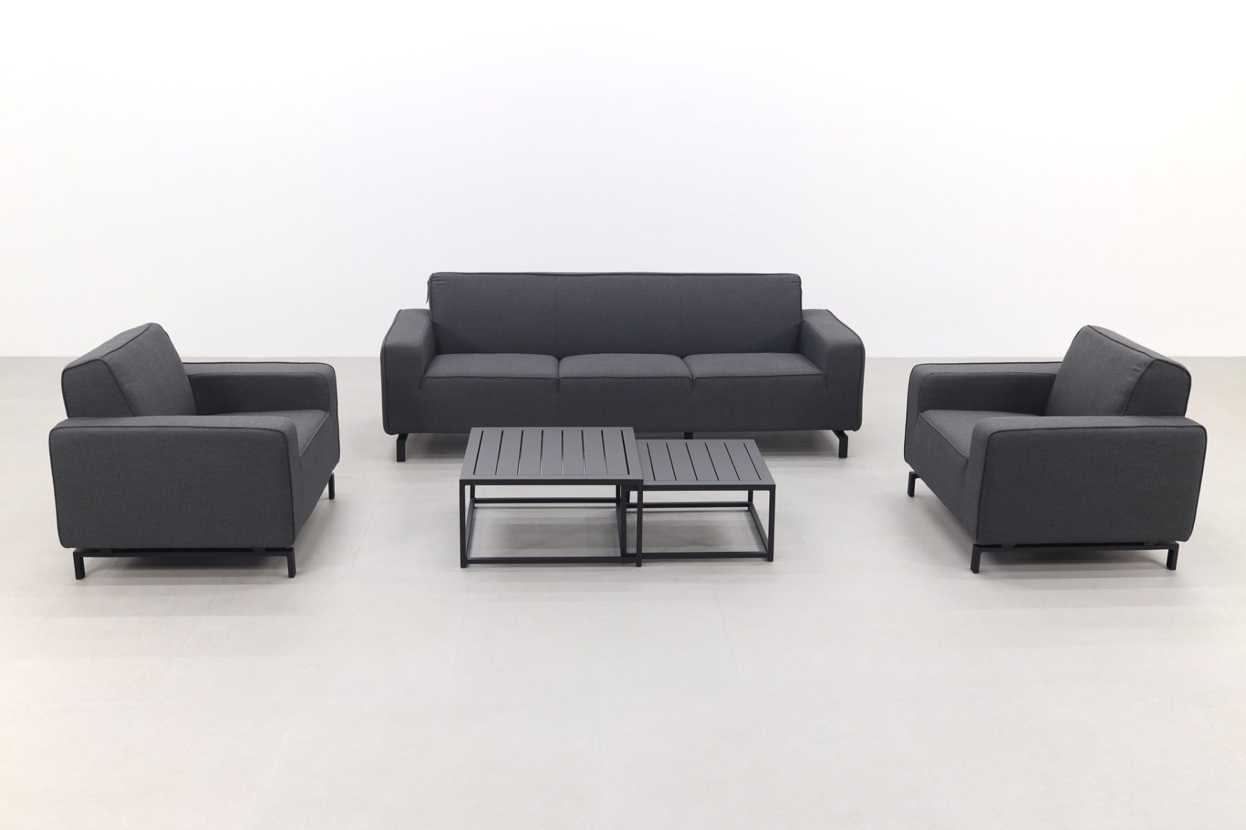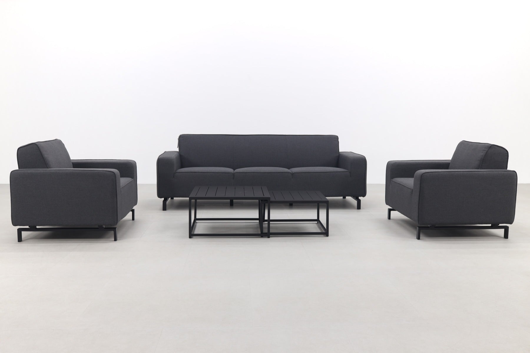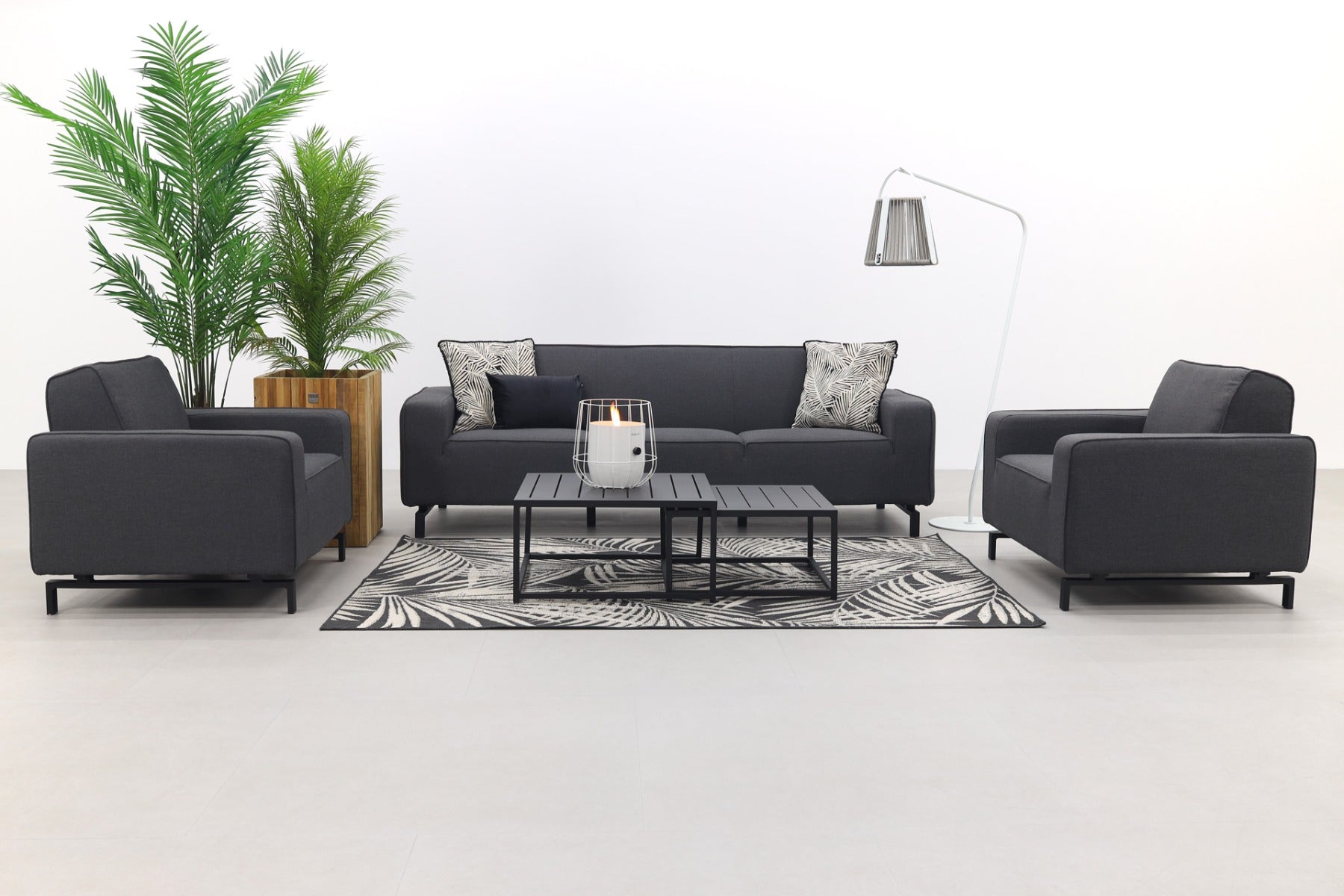 2x Boavista loungestoel - Sooty 1x Boavista loungebank 3-zits - Sooty 1x Royalty loungetafel - 70x70 cm. 1x Royalty loungetafel - 60x60 cm.