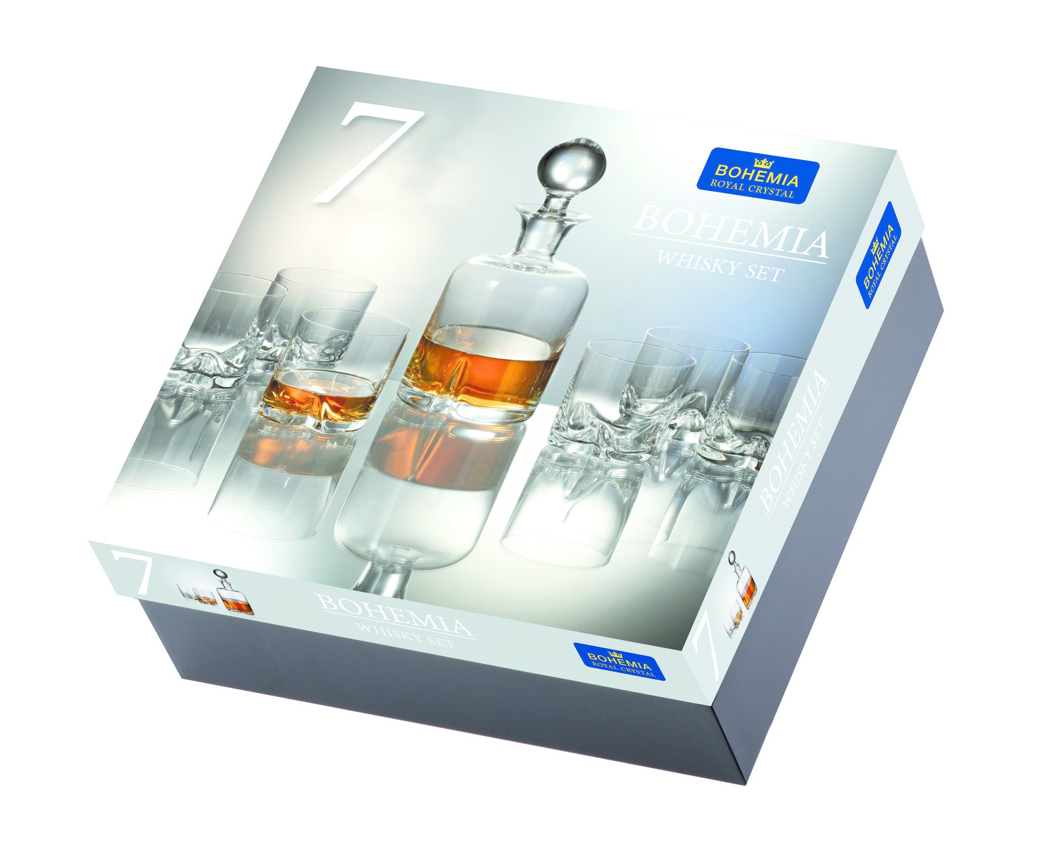 Zeer mooi vormgegeven Trio kristallen whisky set met karaf + stop en 6 whiskyglazen Deze kristallen whisky set bestaat uit: 1 whisky karaf Trio: Volume: 1000 ml 6 Trio whiskyglazen: Volume: 410 ml Gemaakt van hoogwaardig Bohemia kristalglas Verpakt in een mooie cadeau doos