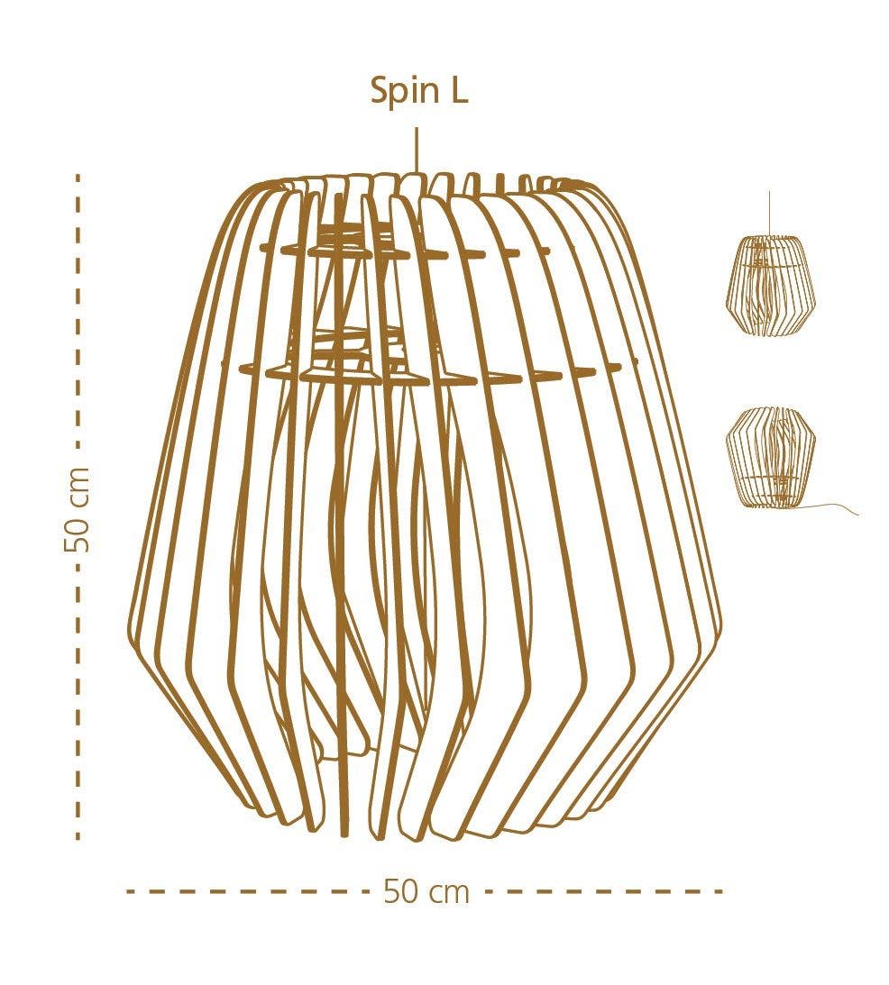 Deze zijn bekleed met kruk en worden stuk voor stuk in het frame geschoven. Hierdoor wordt er een ruimtelijk raster gecreëerd dat een heel bijzonder lichteffect geeft. De boemerangs worden met een kleine hoek geplaatst, waardoor een speciaal ontwerp ontstaat. De Spin hanglamp is verkrijgbaar in vier maten: S, M, L en XL.
