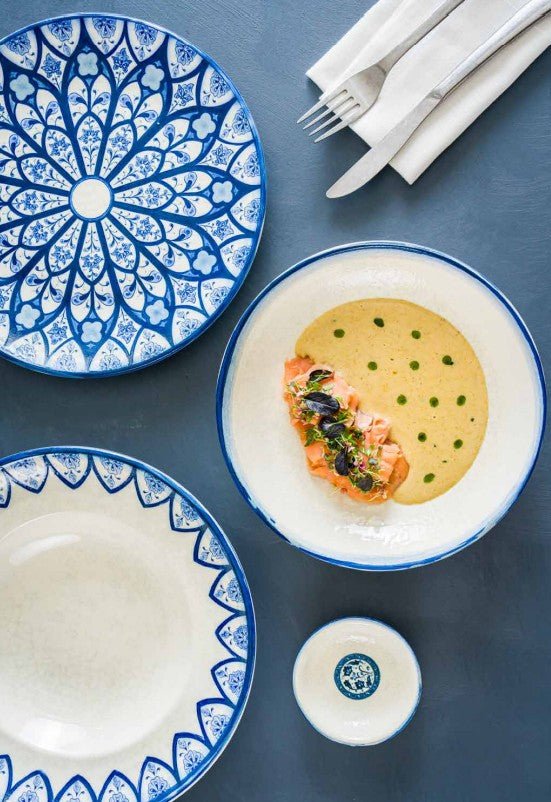 De Esnaf-collectie, met blauwe bloemenpatronen die subtiel geschilderd lijken op een wit canvas, is geïnspireerd op de warmte en oprechtheid van Anatolische ambachtslieden. Deze authentieke collectie, die het traditionele handwerk van de Turkse cultuur weerspiegelt, brengt een gezellige en vriendelijke sfeer in restaurants. De levendige blauwtint verwelkomt uw gasten met enthousiasme.