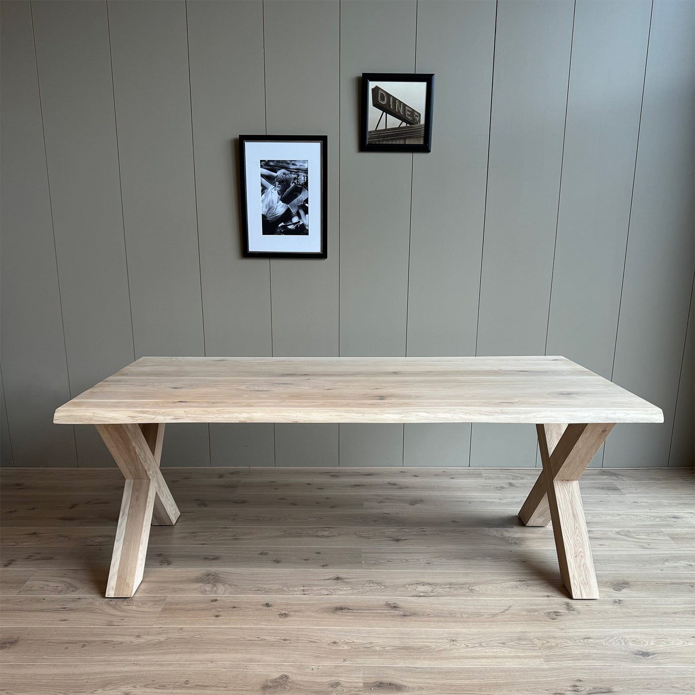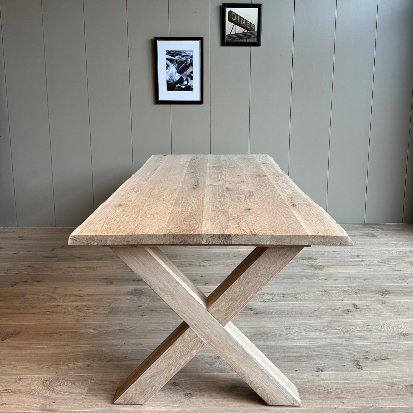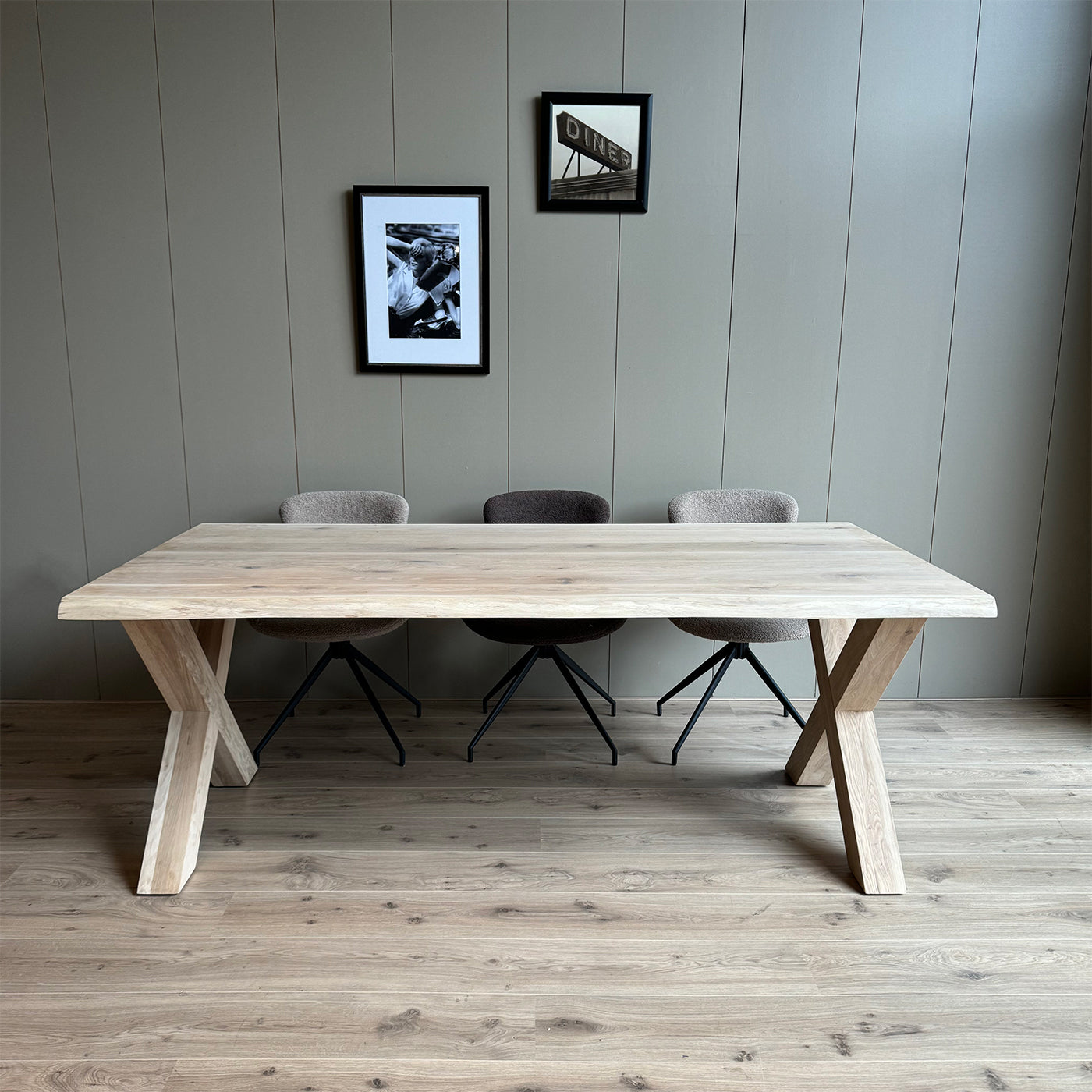 Het massieve eikenhout van het tafelblad zorgt voor een rustige, natuurlijke uitstraling die in contrast staat met houtsoorten zoals mangohout en acaciahout. De combinatie van het onbehandelde eikenhout met de robuuste, eikenhouten X-poten geeft de tafel een warme, landelijke, en tegelijkertijd industriële uitstraling.