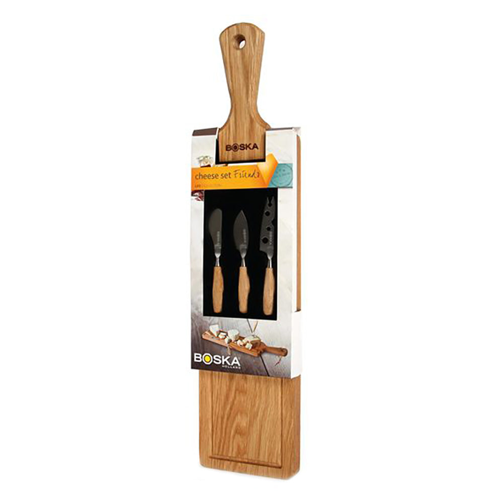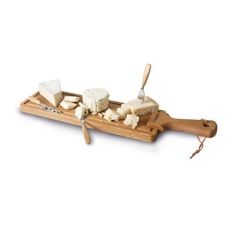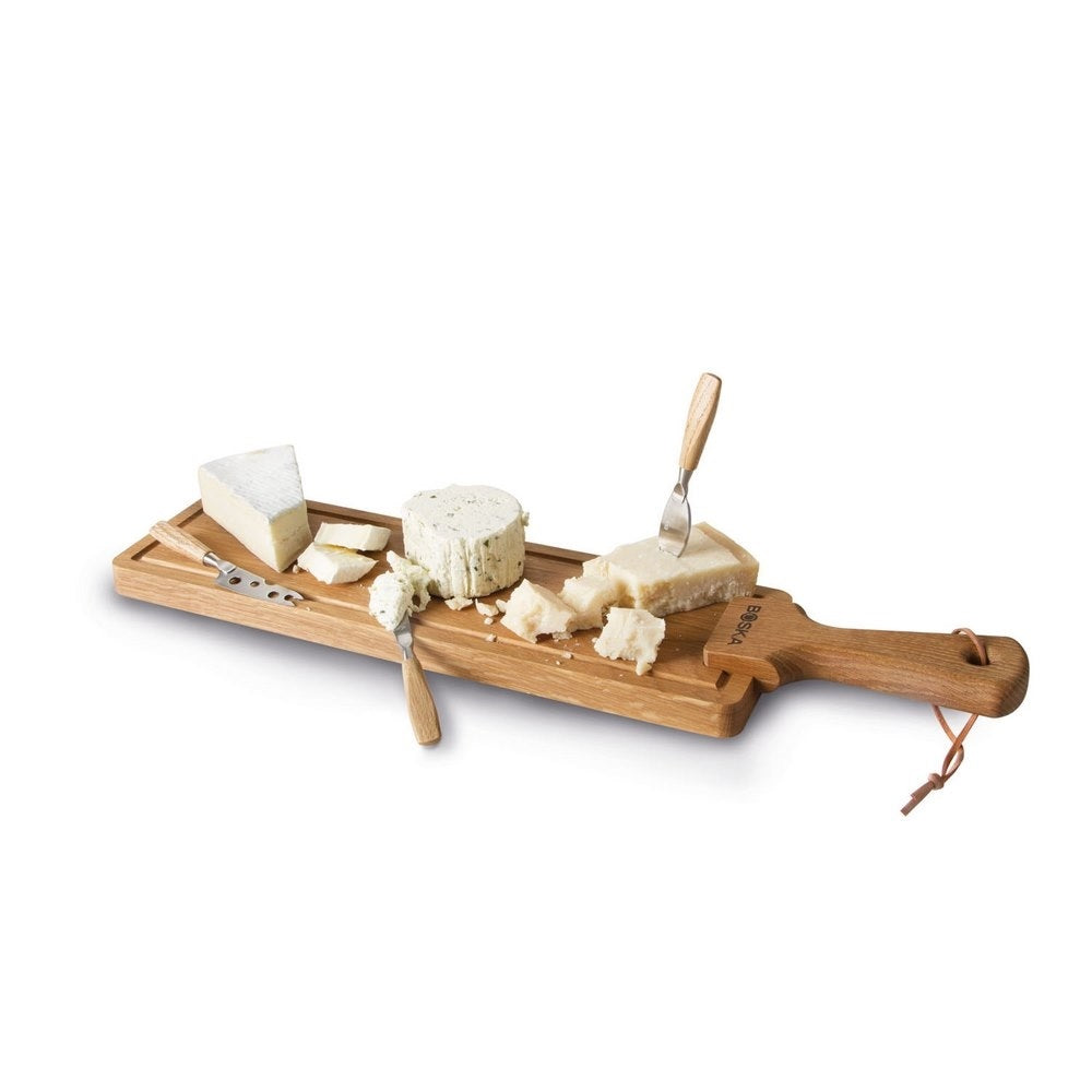 Samen genieten Je favoriete kaas ziet er nog lekkerder uit op een mooi plankje, zoals deze van Boska! Hij is gemaakt van Europees eikenhout en wordt geleverd met bijpassende kaasmessen. Deze zijn gemaakt van roestvrijstaal en hebben een eikenhouten handvat, waardoor ze mooi bij de plank passen. Verzorg je de messen en plank goed? Dan geniet je er jaren lang van!