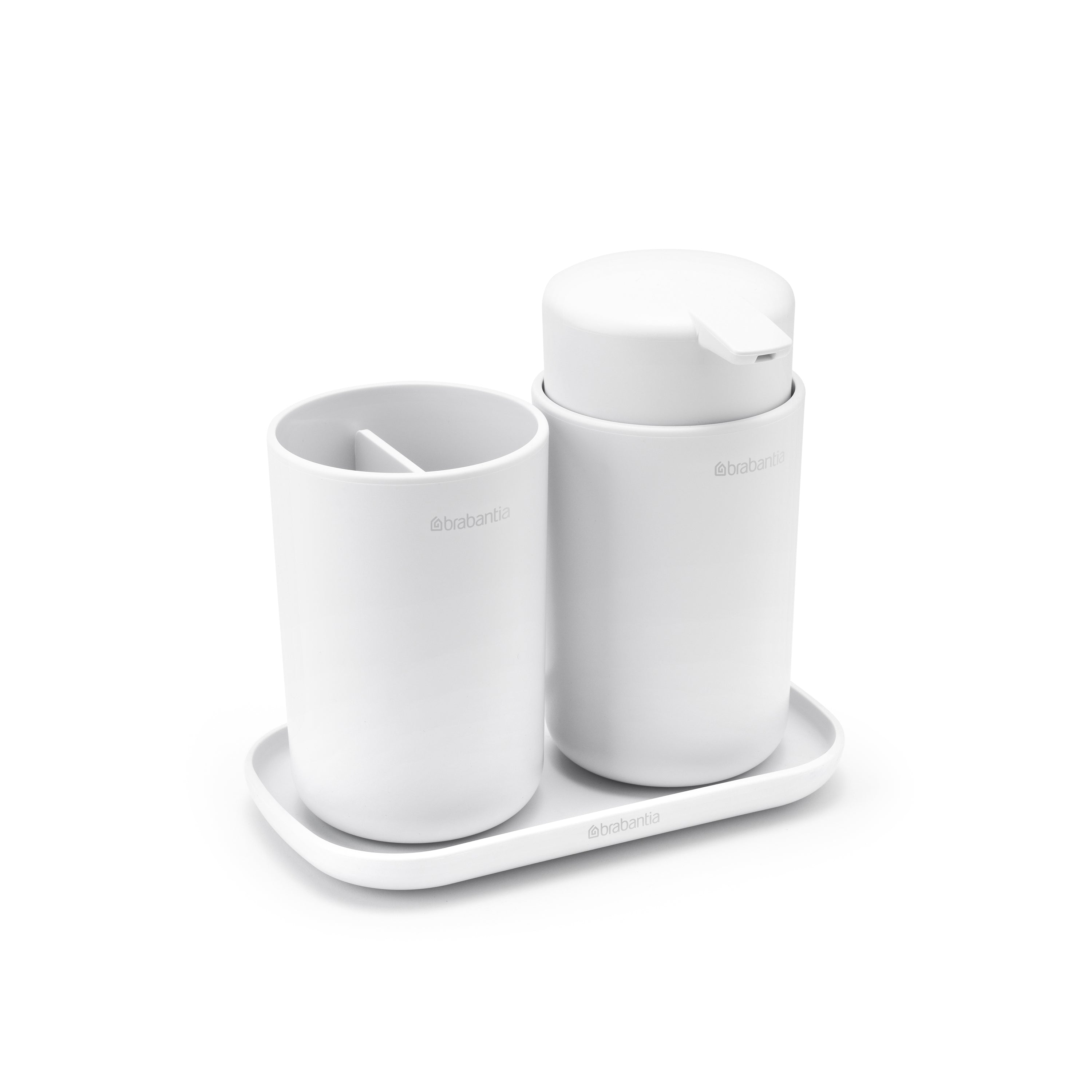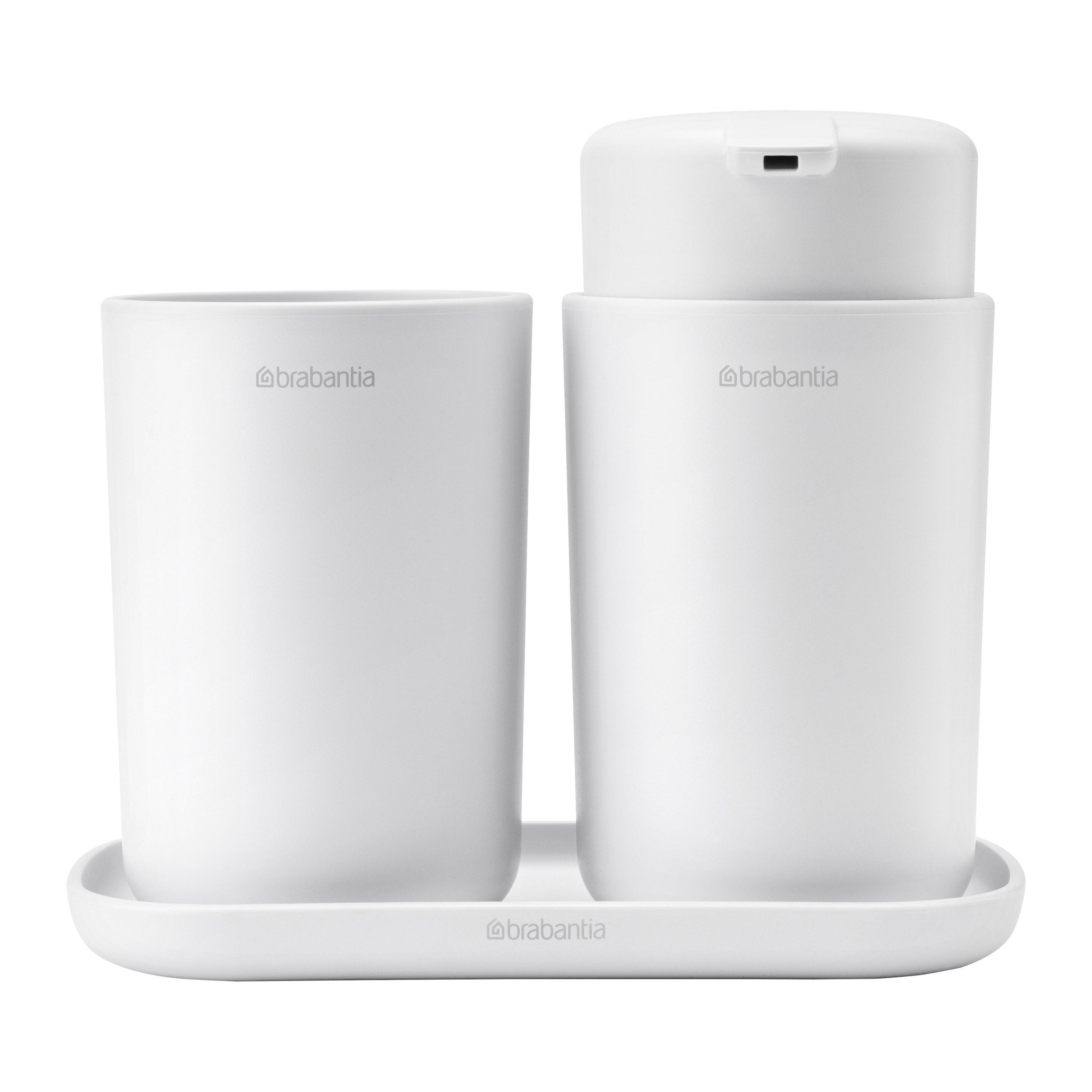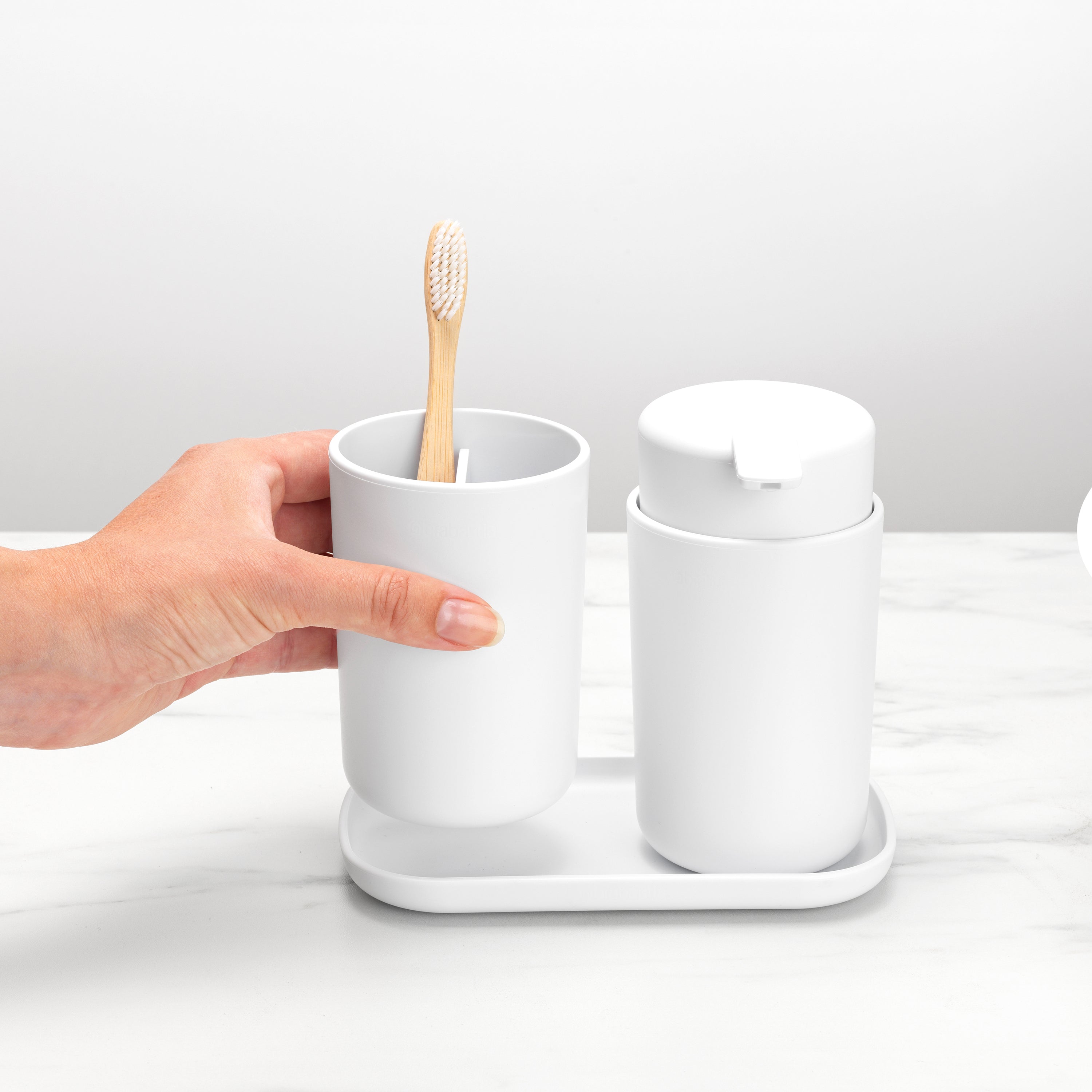 - Praktische trio: zeeppomp, tandenborstelhouder en schaal