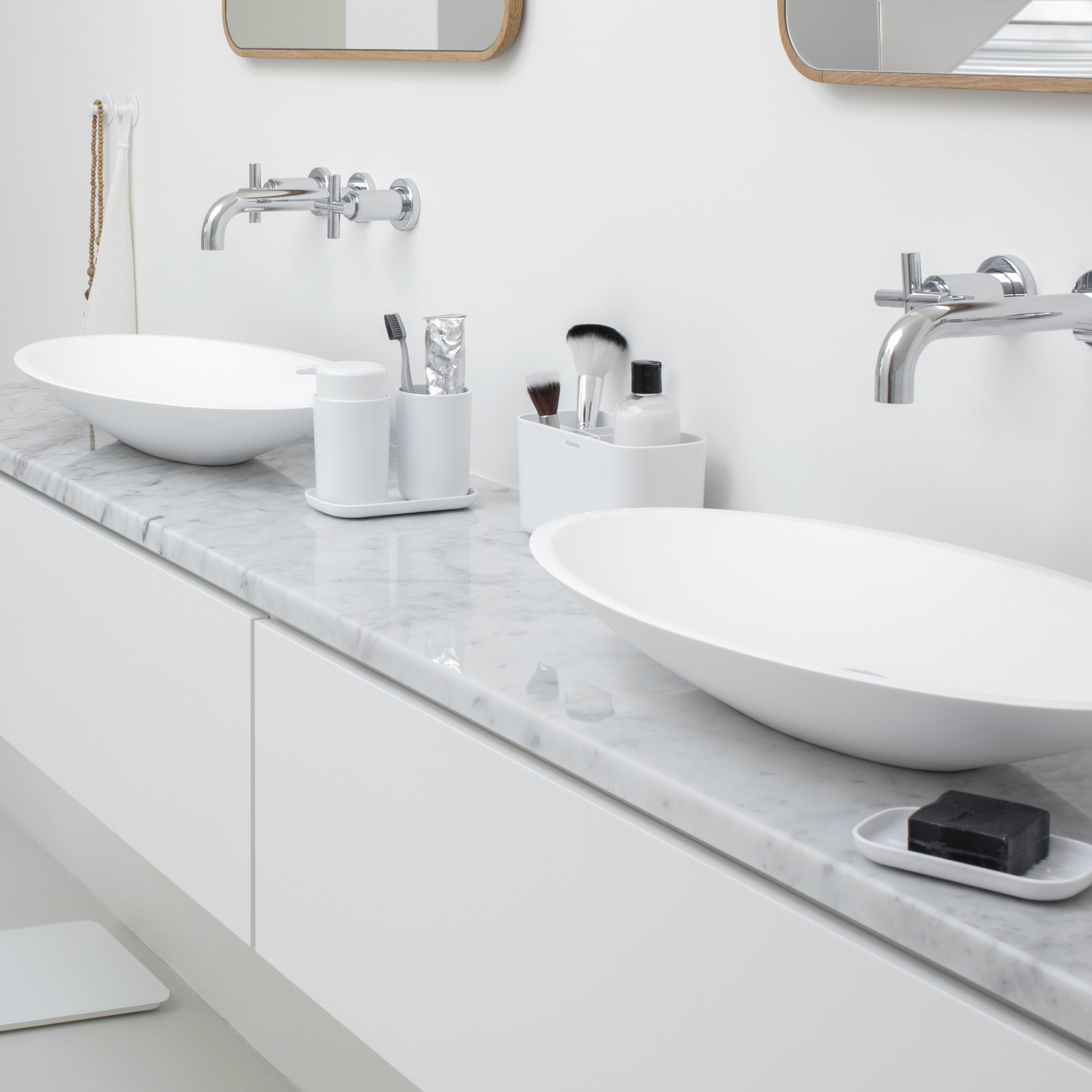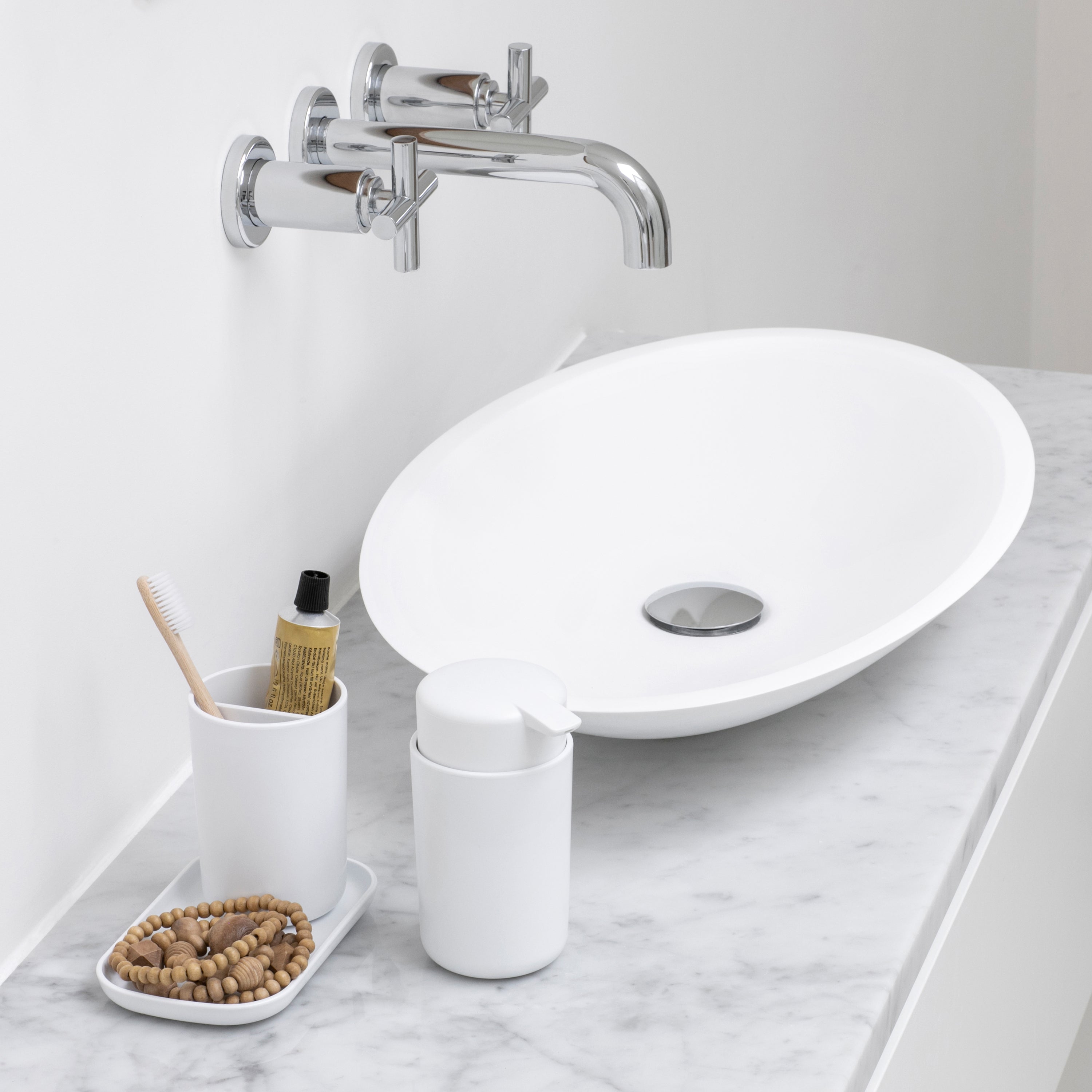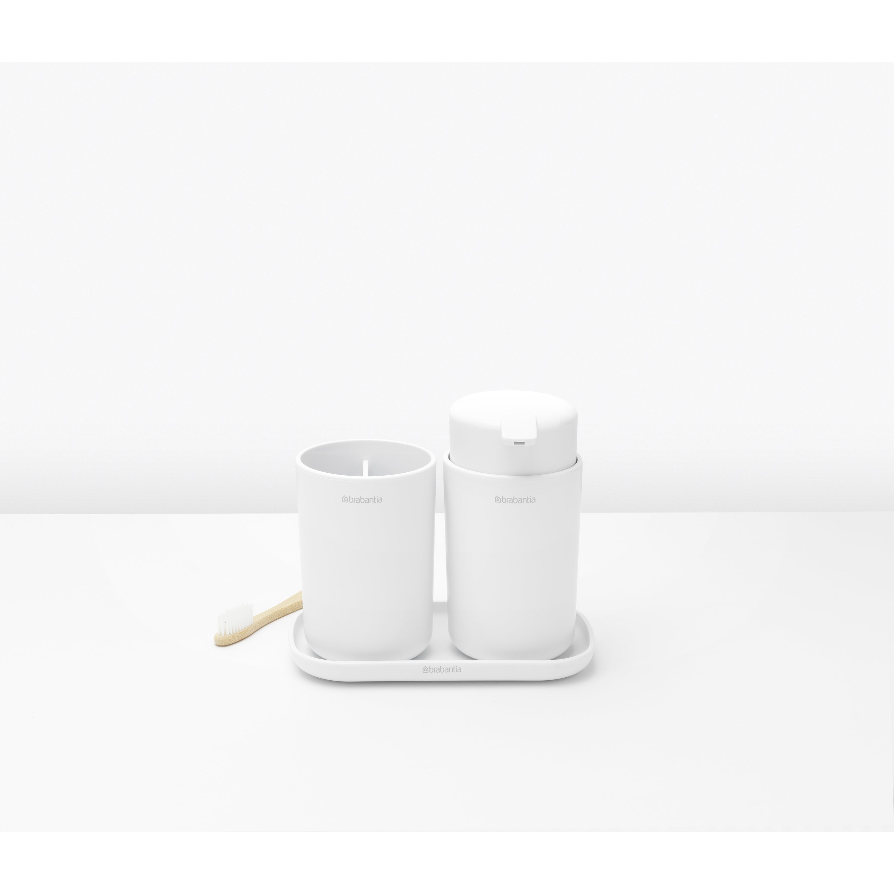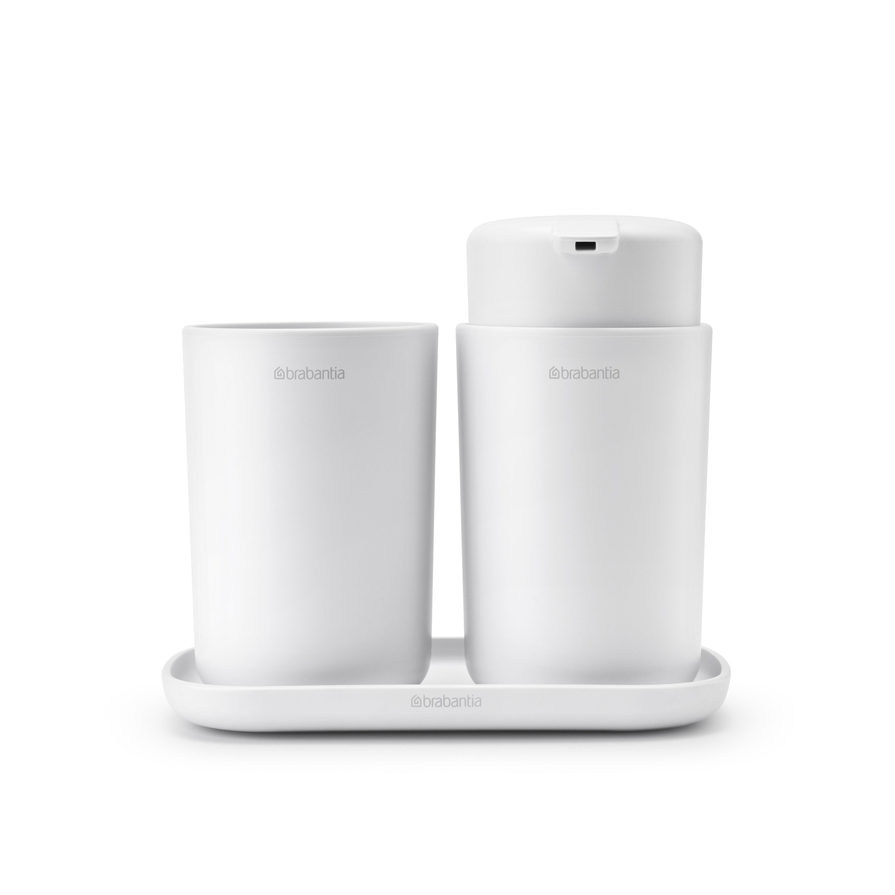 - Praktische trio: zeeppomp, tandenborstelhouder en schaal