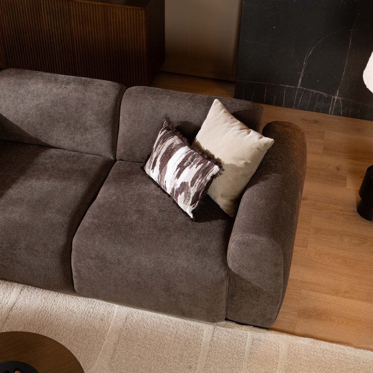 De zachte, afgeronde armleuningen nodigen uit tot ontspannen zitten, terwijl de volledig gestoffeerde zitting tot aan de vloer zorgt voor een strakke en luxe uitstraling. De bank heeft een lage rugleuning en een lage zit en is geschikt voor 2 tot 3 personen.