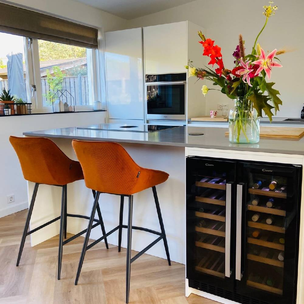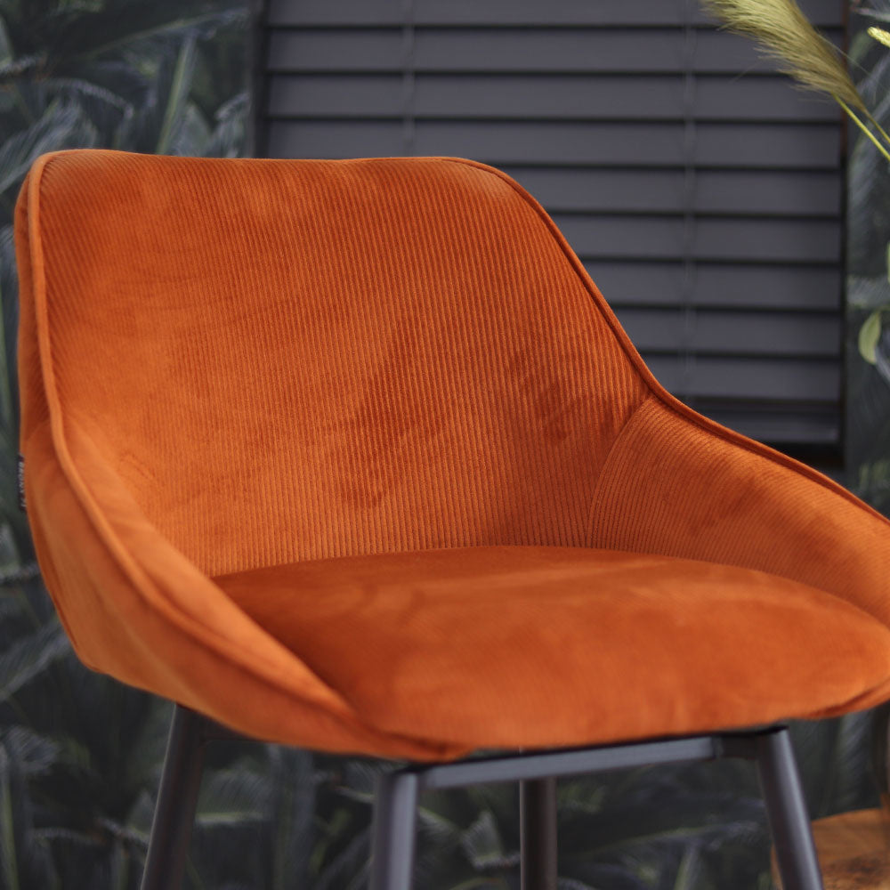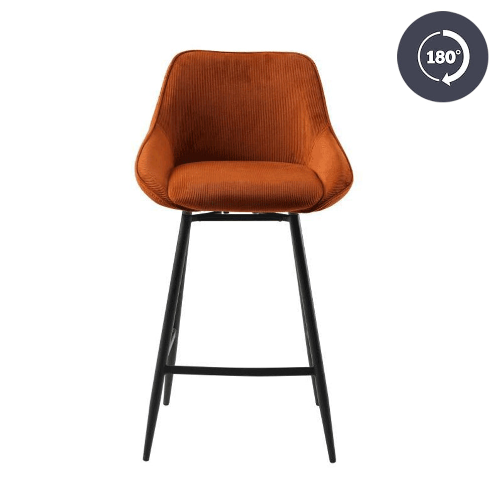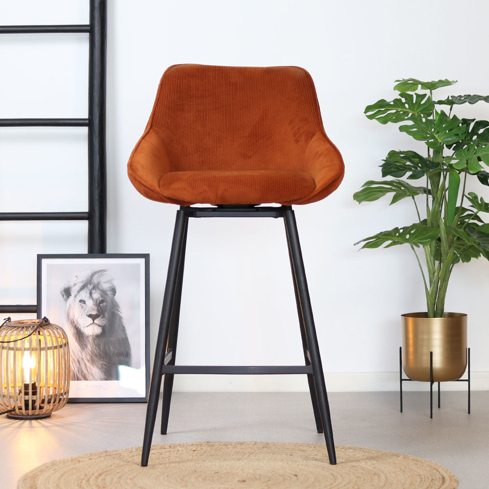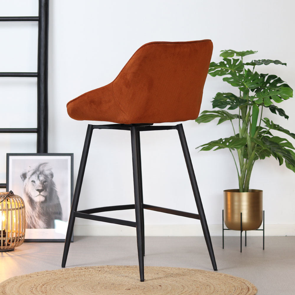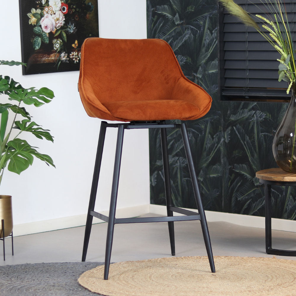 De draaibare barkruk Luna is de perfecte combinatie van luxe en stoer. De barkruk is namelijk gemaakt van een mooie ribstof met een zwart gepoedercoat metalen onderstel. Hierdoor is de barstoel makkelijk te plaatsen in een industrieel interieur, maar ook een modern of landelijk interieur. Luna is voorzien van een rugleuning waardoor de barstoel comfortabel zit, daarnaast is de zitting 180° draaibaar! Bovendien draait de zitting altijd terug naar de rechte zit, waardoor de barkruk altijd netjes bij je tafel staat. Mooi en praktisch!