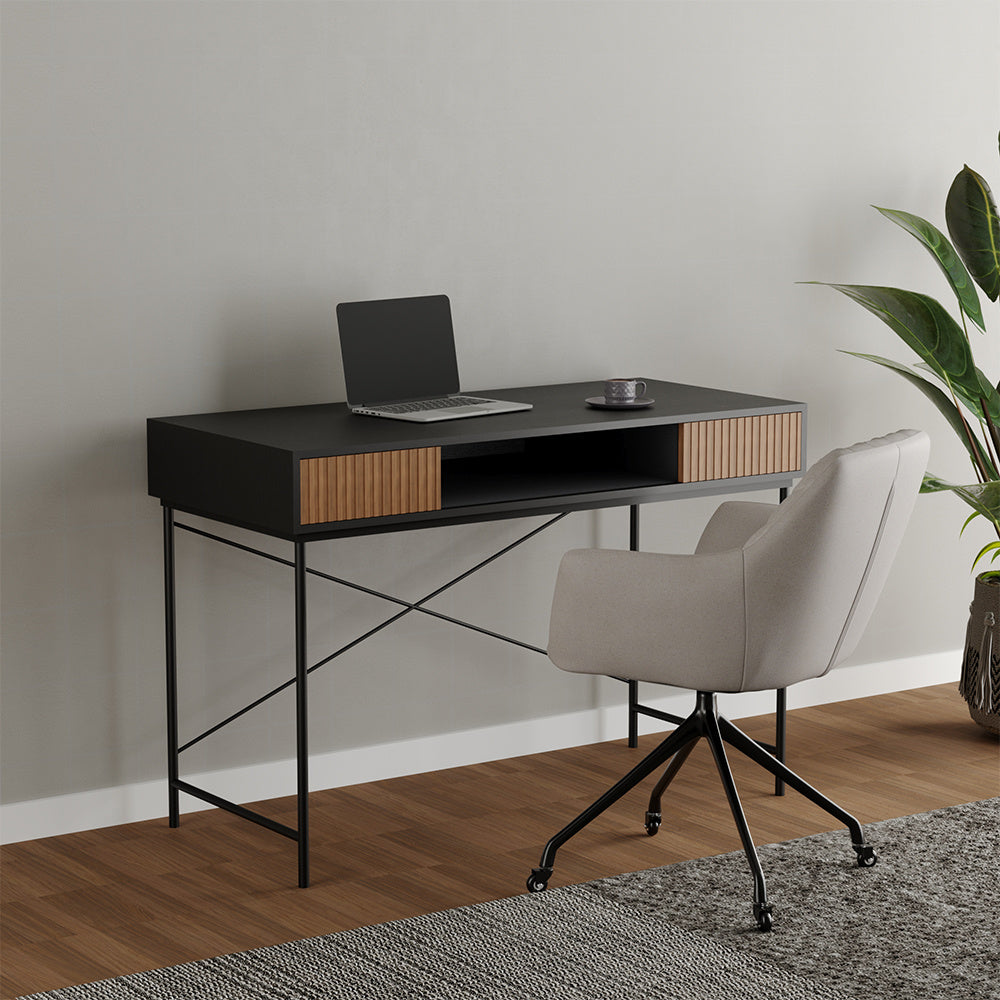 - Het bureau geeft met twee lades voldoende ruimte om spullen op te bergen.