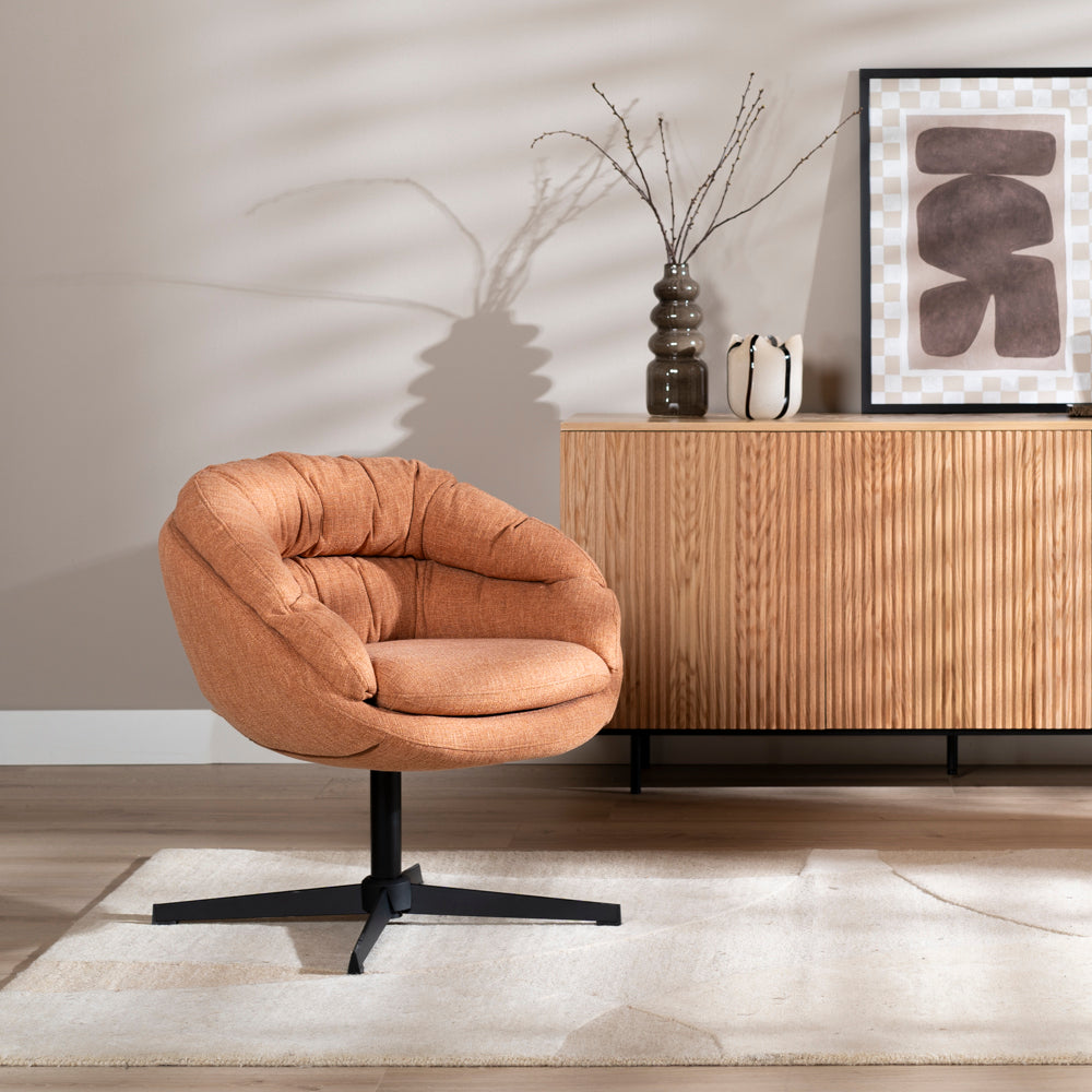 De subtiele glans van de koperen tint en de verfijnde textuur van het linnen geven deze fauteuil niet alleen functionaliteit, maar maakt het tevens tot een prachtige toevoeging aan je interieur. Op deze manier kun je eenvoudig een stijlvolle en uitnodigende sfeer in huis creëren, waar ontspanning en elegantie samenkomen. Dankzij het tijdloze ontwerp past de fauteuil moeiteloos in diverse interieurstijlen, variërend van Scandinavisch tot modern.