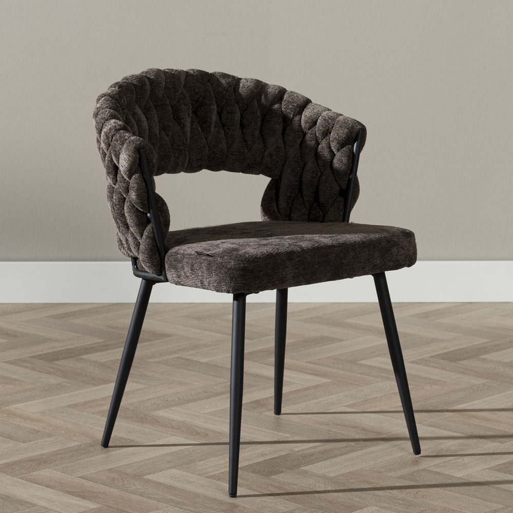 Met onze zachte hoogpolige chenille stof breng je niet alleen comfort naar je eetkamer, maar voeg je ook een vleugje verfijning en stijl toe aan je huis. Daarbij is de gevlochten open rugleuning een opvallend kenmerk dat niet alleen visueel aantrekkelijk is, maar ook extra ondersteuning biedt. Het vlechtwerk geeft de eetkamerstoel extra textuur, waardoor het een nog uniekere uitstraling krijgt.
