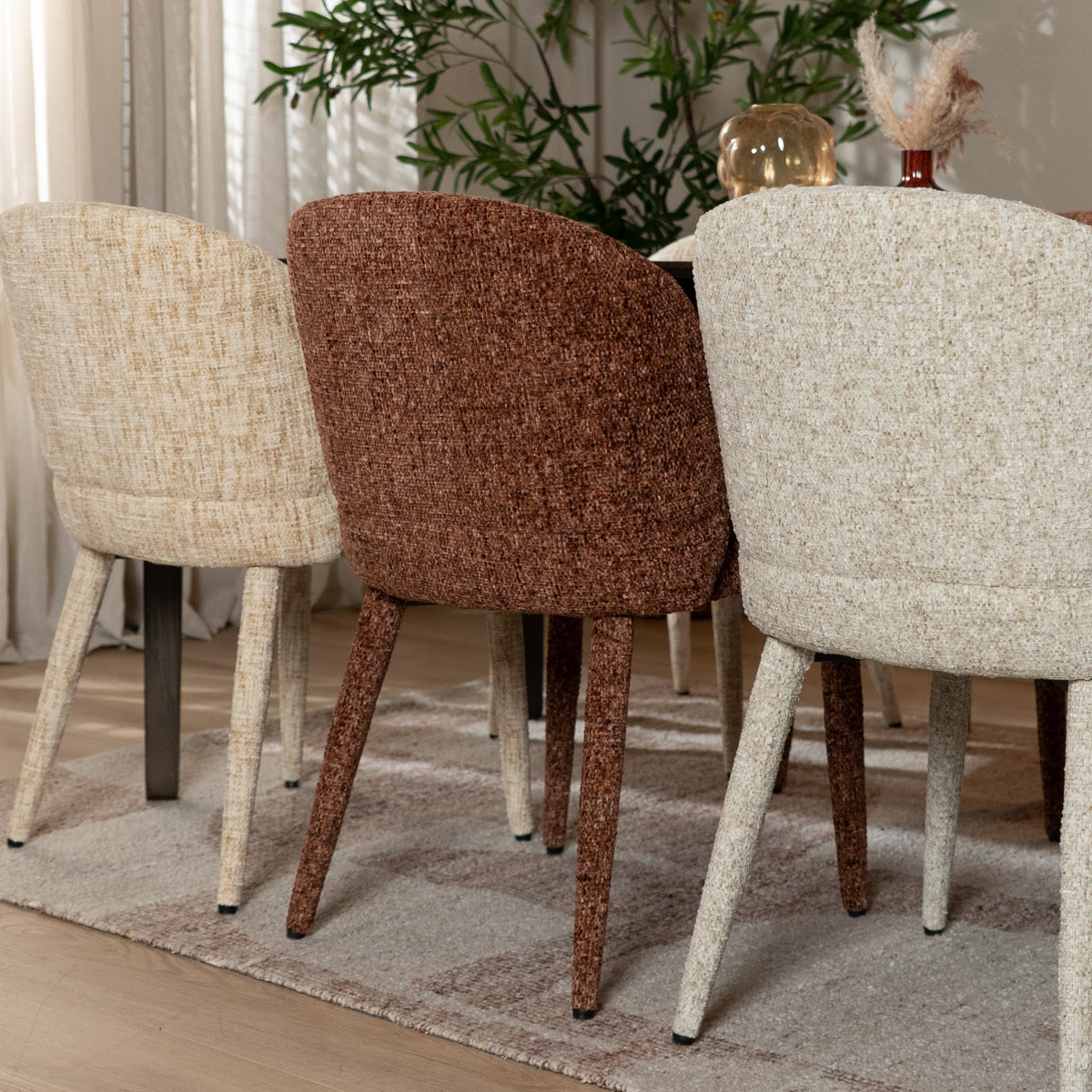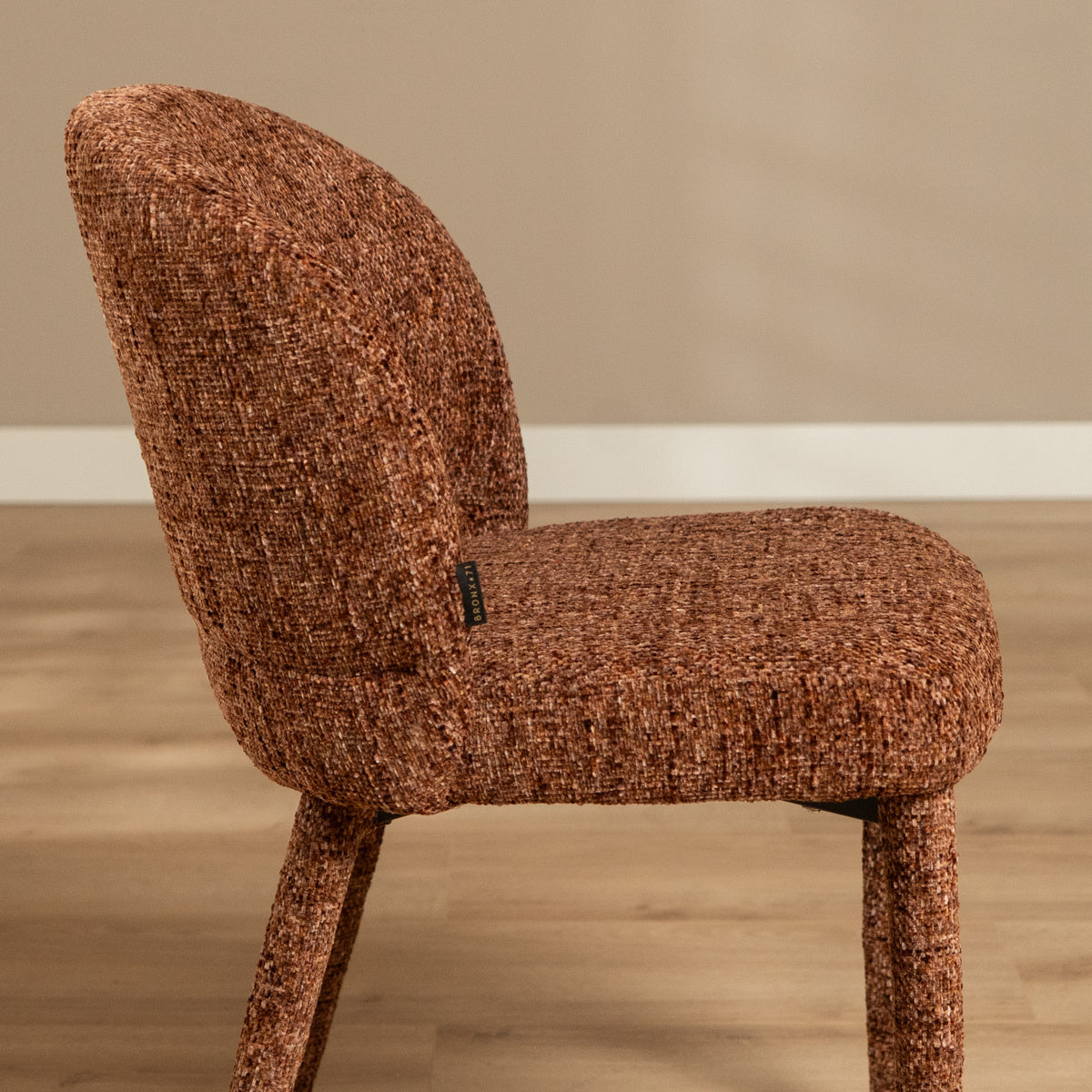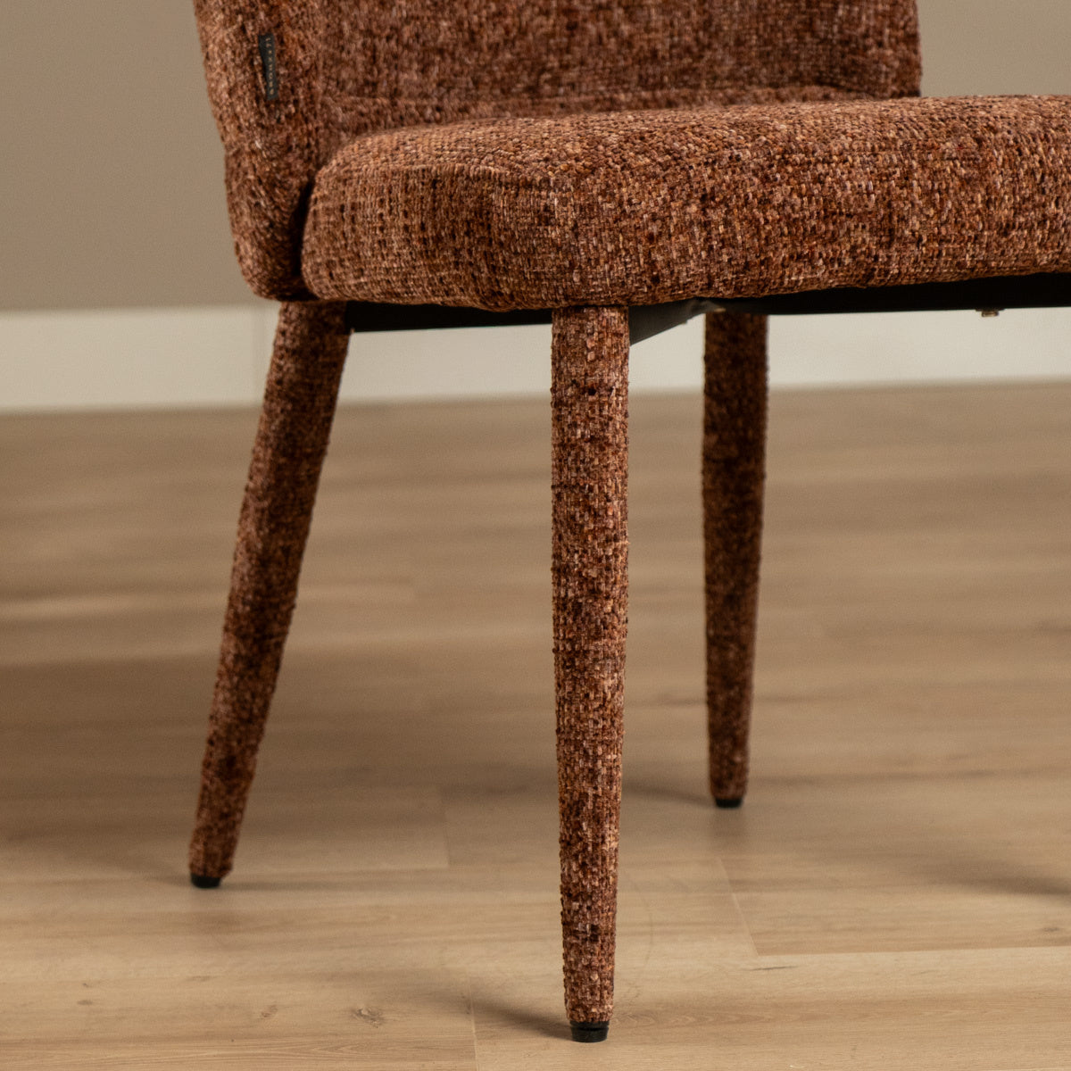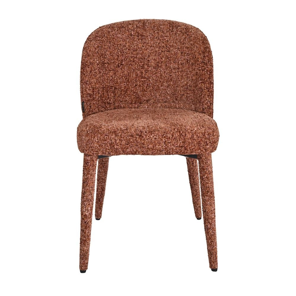 De Charlie is bekleed met een chenille stof, een hoogwaardige grof geweven meubelstof die kracht en comfort perfect combineert. De robuuste structuur voelt zacht en fluweelachtig aan, terwijl subtiele kleurschakeringen in de koperkleur zorgen voor een levendig en eigentijds karakter. Dankzij de waterafstotende en vuilwerende eigenschappen blijft de stoel niet alleen mooi, maar ook praktisch in gebruik: ideaal voor lange diners, gezellige borrels of zelfs intensief zakelijk gebruik.