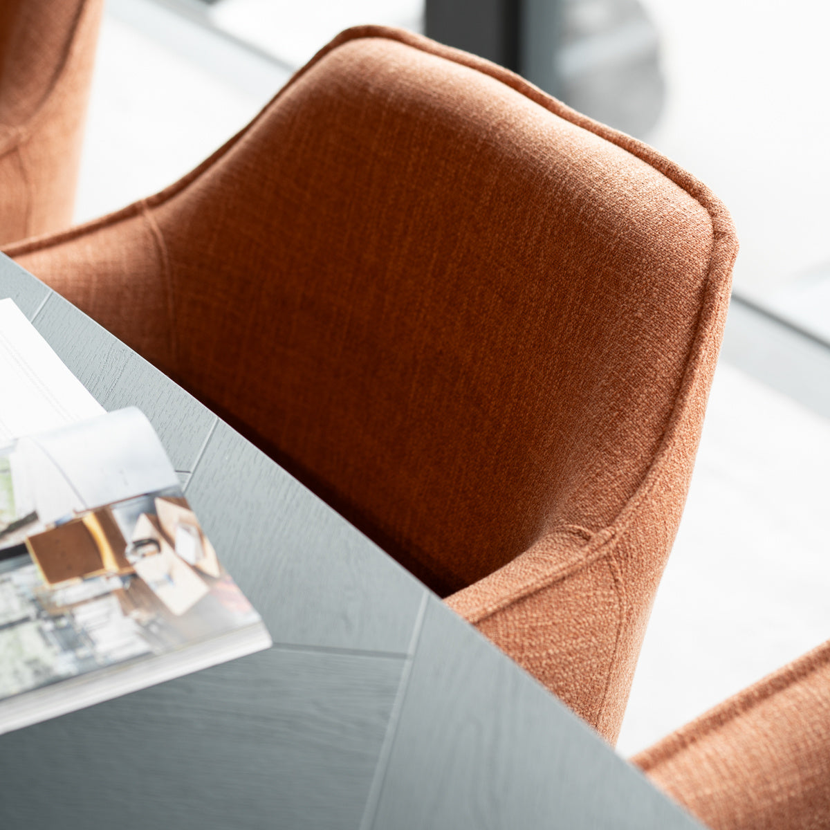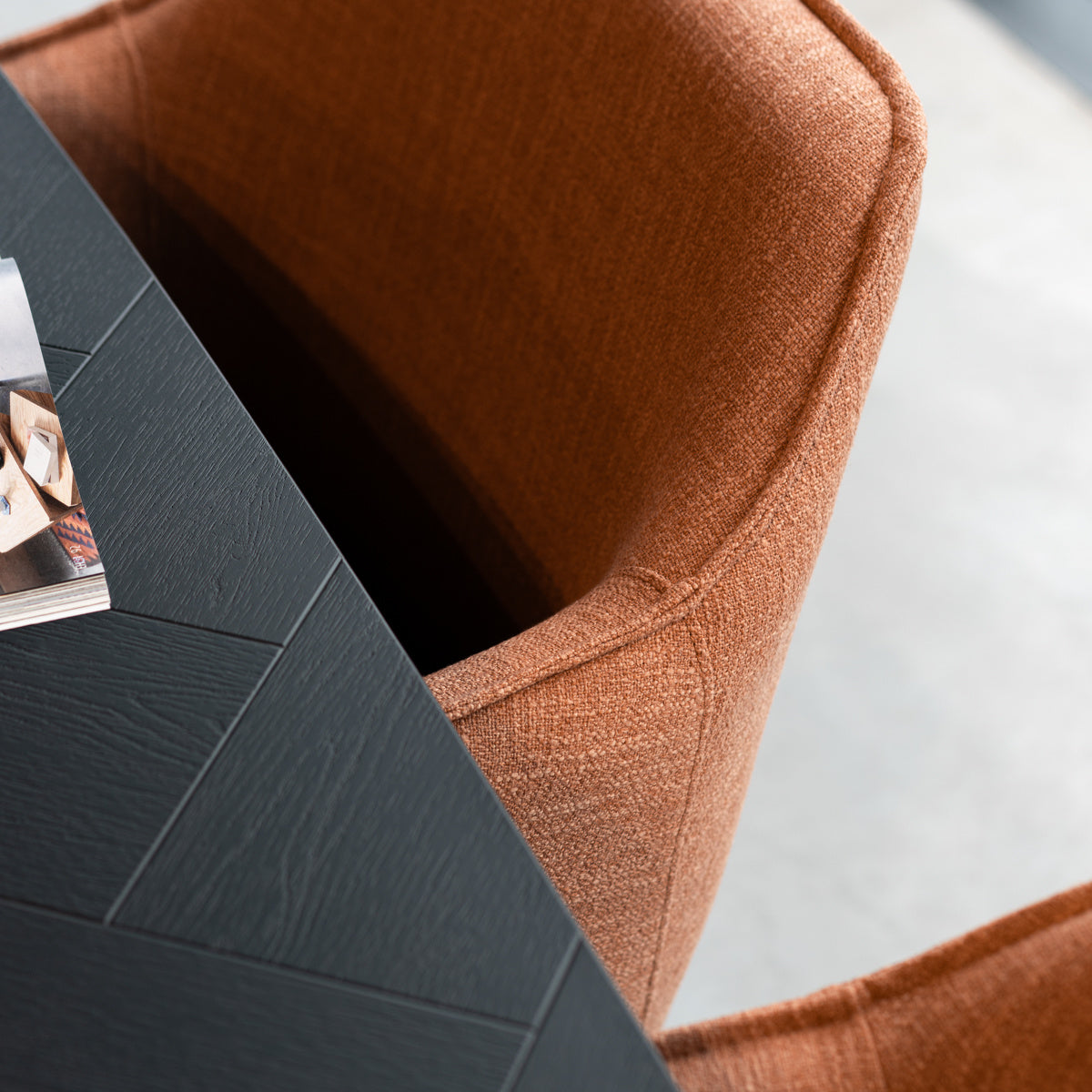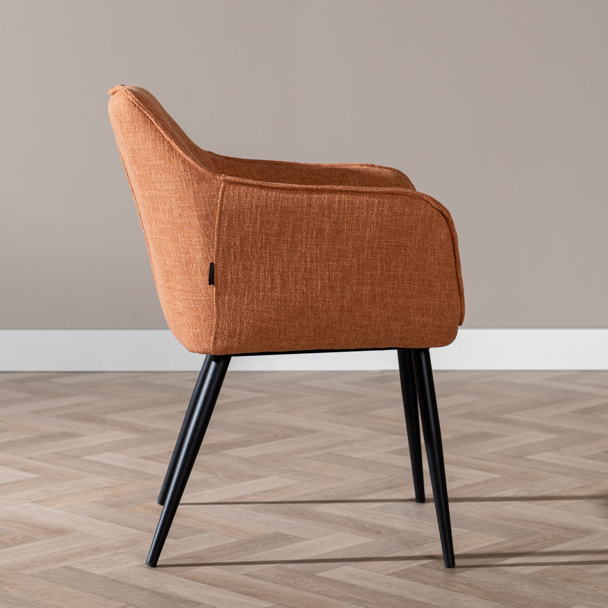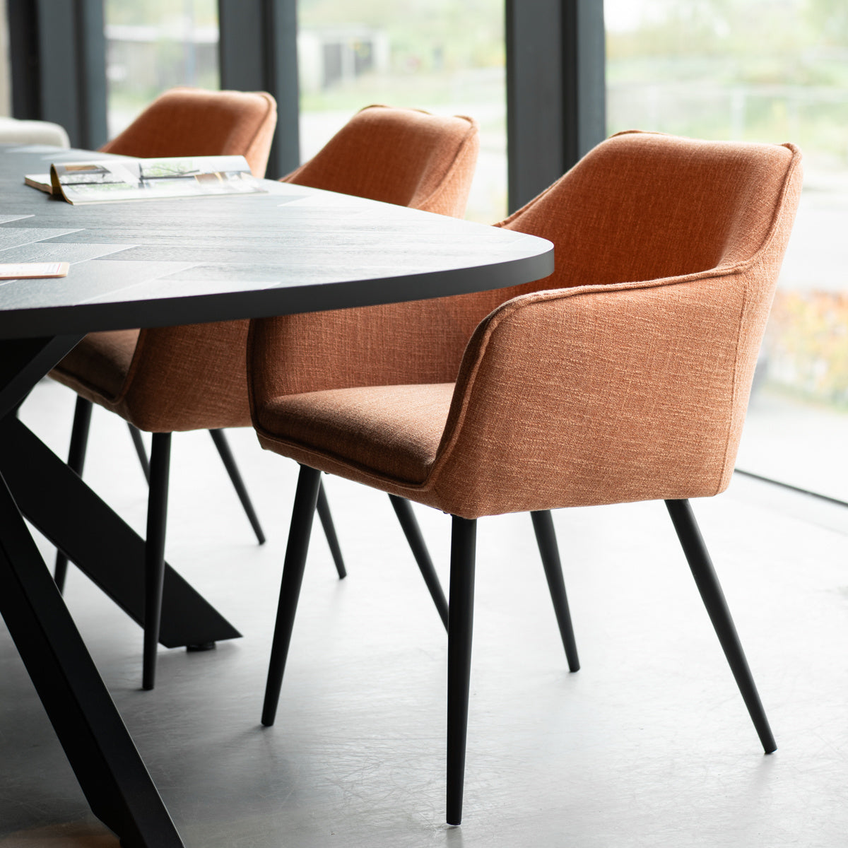De stof is een polyester stof bestaande uit 85% polyester en 15% linnen. De koperen kleur van de Ciara eetkamerstoel geeft een warme en luxe uitstraling aan jouw interieur met een mooie oranje ondertoon. Het zwarte frame in combinatie met de linnen koperen stoffering zorgen voor een harmonieus geheel.