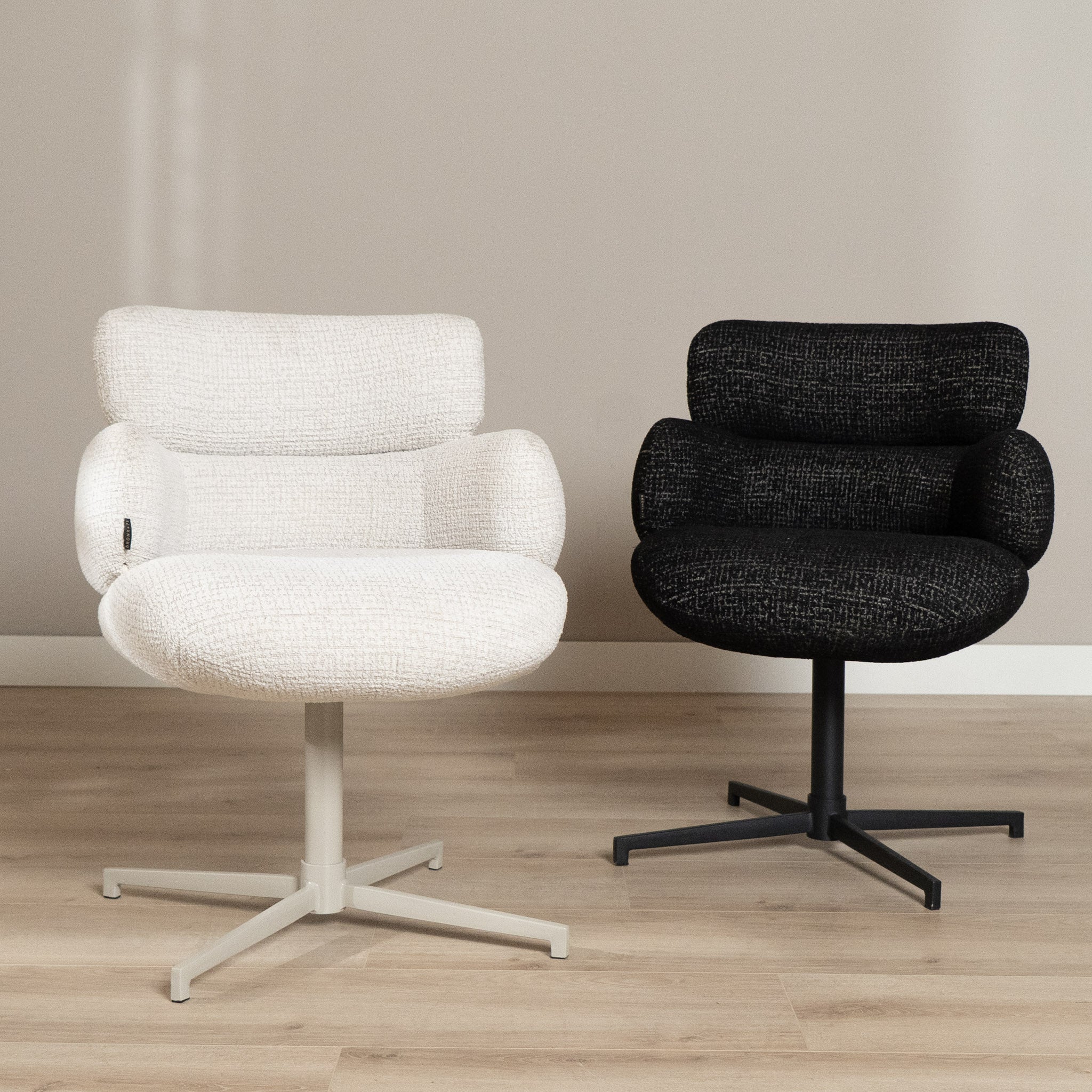De Coco eetkamerstoel is een perfecte combinatie van stijl en zitcomfort. Eetkamerstoel Coco is 180 graden draaibaar. De beklede zitting en rugleuning zorgen voor een verfijnde uitstraling, terwijl de ronde vormen en zachte armleuningen extra ondersteuning bieden. Hierdoor is Coco ideaal voor lange diners of vergaderingen waarbij comfort belangrijk is.