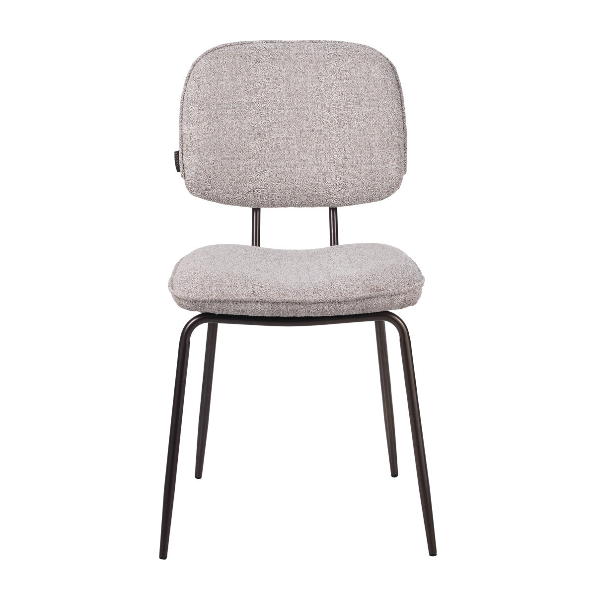 Eetkamerstoel Javi is de perfecte eetkamerstoel als je een minimalistisch design zoekt, maar ook nog comfortabel wil zitten. Door het donkerbruine stalen frame met glanzende finish in combinatie met de luxe gemêleerde stof heeft de stoel een