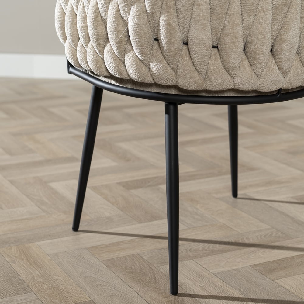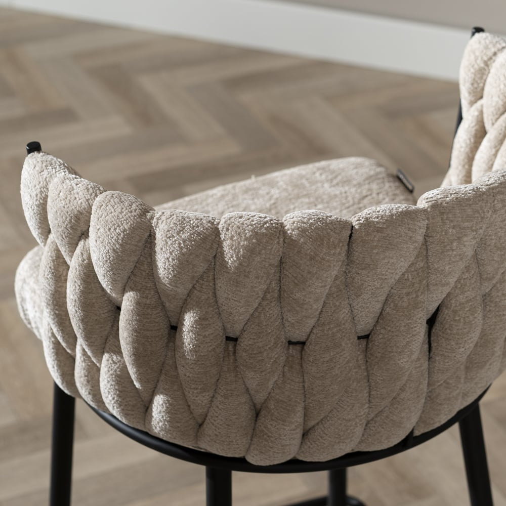 Met onze zachte hoogpolige chenille stof breng je niet alleen comfort naar je eetkamer, maar voeg je ook een vleugje verfijning en stijl toe aan je huis. Daarbij is de gevlochten rugleuning een opvallend kenmerk dat niet alleen visueel aantrekkelijk is, maar ook extra ondersteuning biedt. Het vlechtwerk geeft de eetkamerstoel extra textuur, waardoor het een nog uniekere uitstraling krijgt.