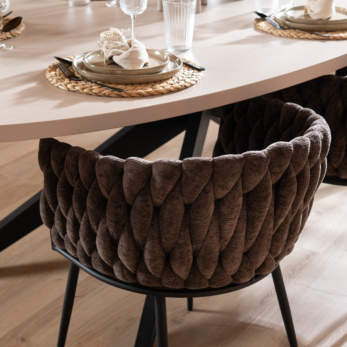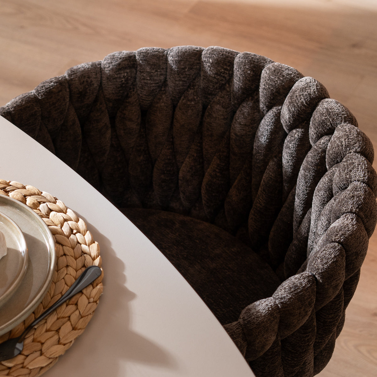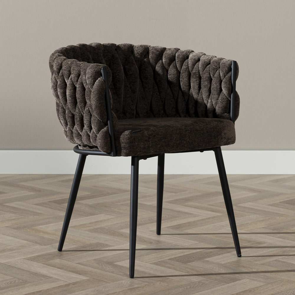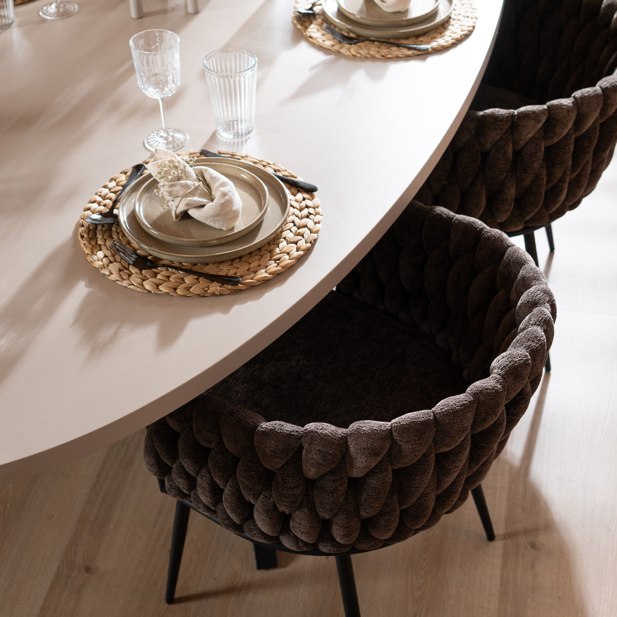 Met onze zachte hoogpolige chenille stof breng je niet alleen comfort naar je eetkamer, maar voeg je ook een vleugje verfijning en stijl toe aan je huis. Daarbij is de gevlochten rugleuning een opvallend kenmerk dat niet alleen visueel aantrekkelijk is, maar ook extra ondersteuning biedt. Het vlechtwerk geeft de eetkamerstoel extra textuur, waardoor het een nog uniekere uitstraling krijgt.