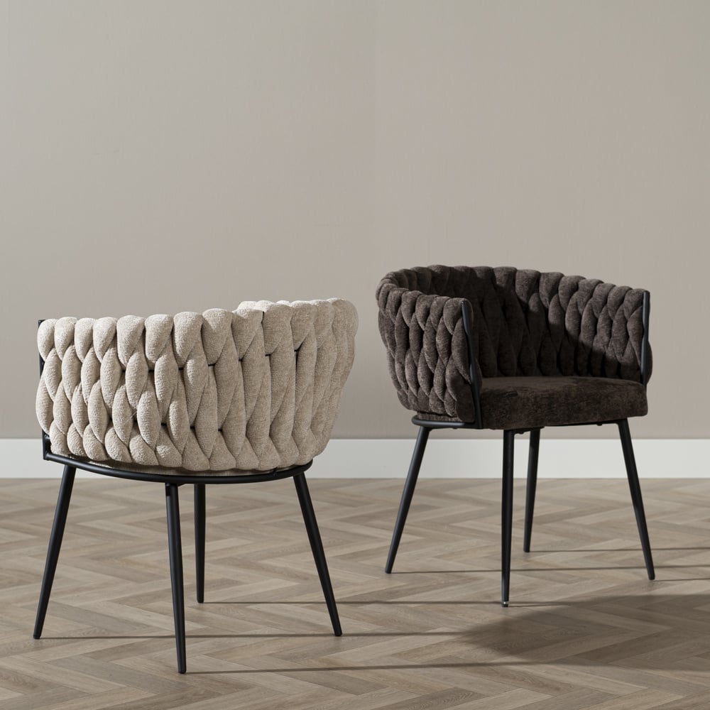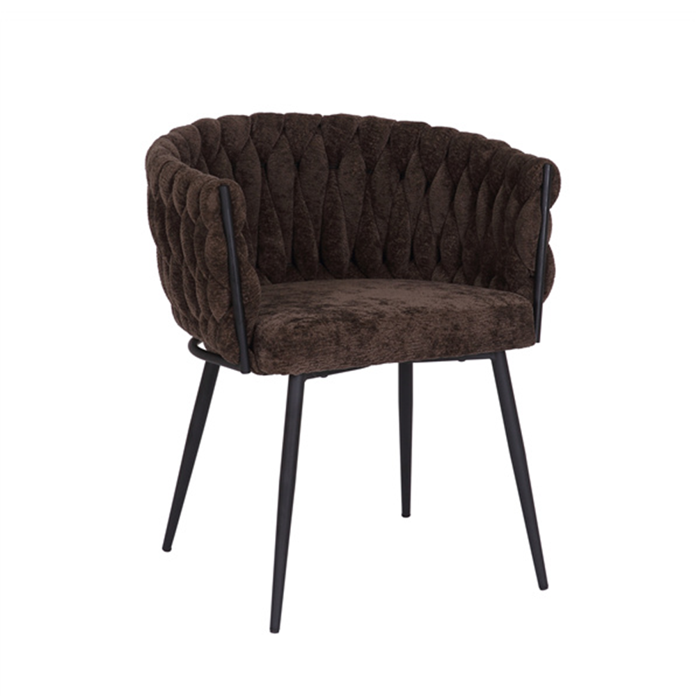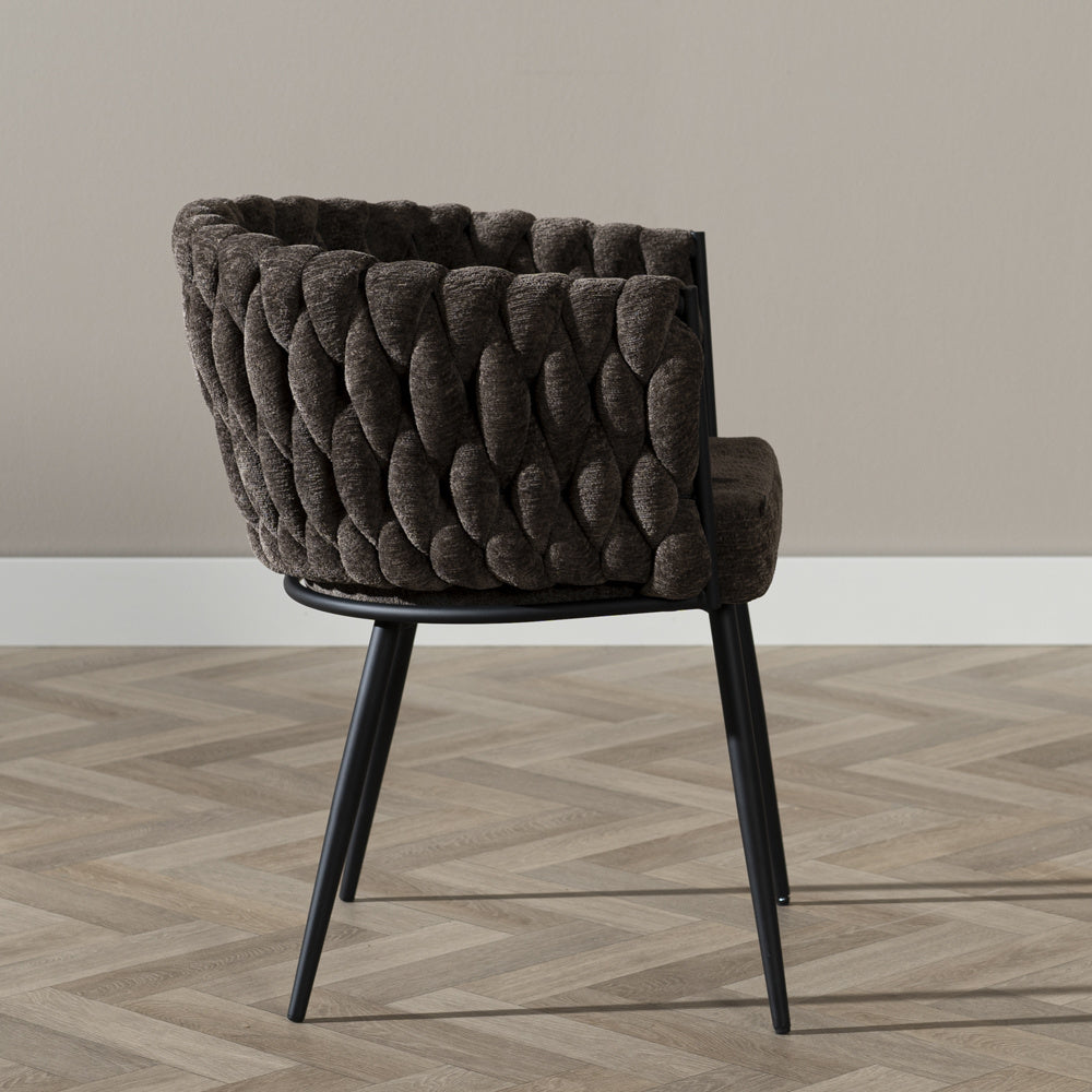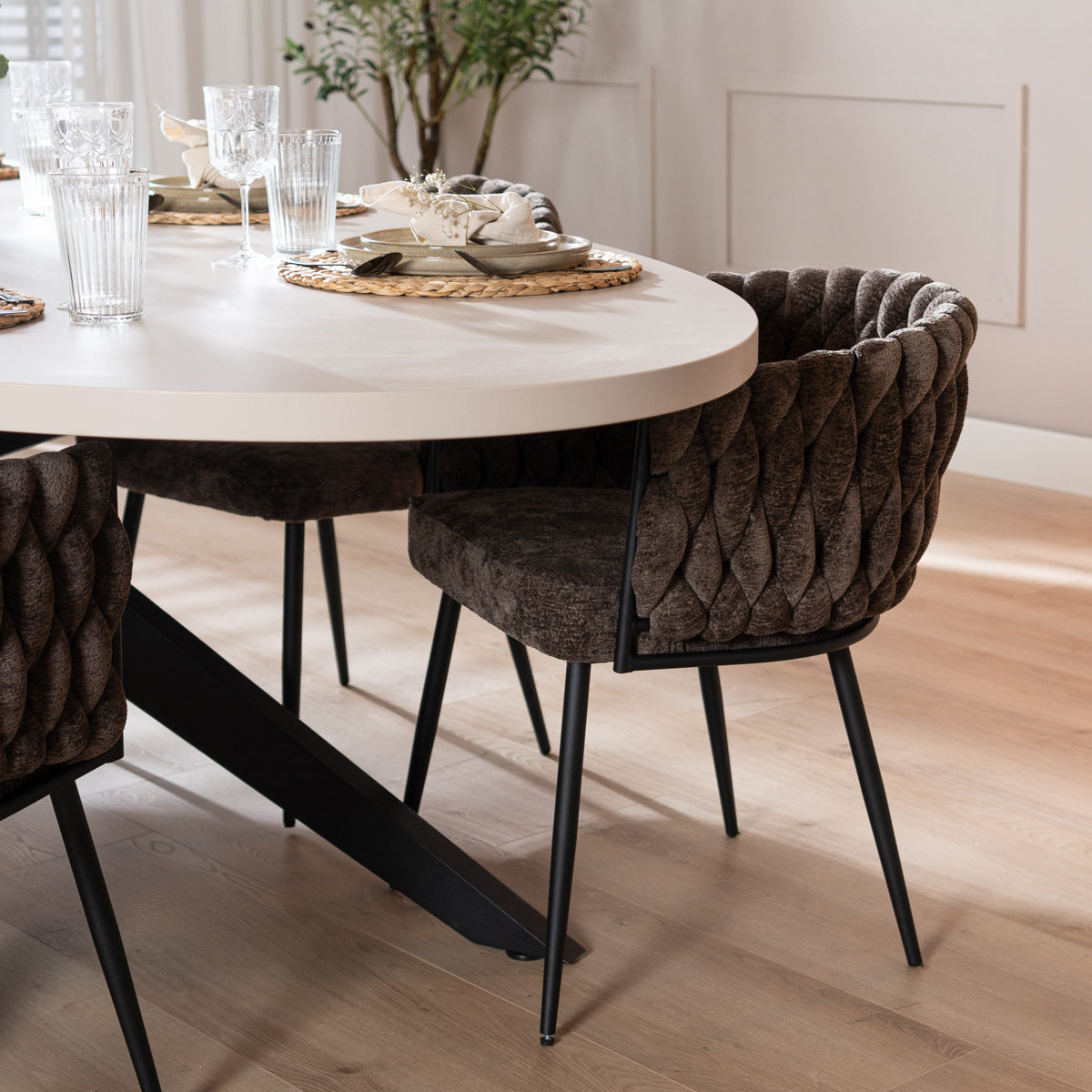 Met onze zachte hoogpolige chenille stof breng je niet alleen comfort naar je eetkamer, maar voeg je ook een vleugje verfijning en stijl toe aan je huis. Daarbij is de gevlochten rugleuning een opvallend kenmerk dat niet alleen visueel aantrekkelijk is, maar ook extra ondersteuning biedt. Het vlechtwerk geeft de eetkamerstoel extra textuur, waardoor het een nog uniekere uitstraling krijgt.