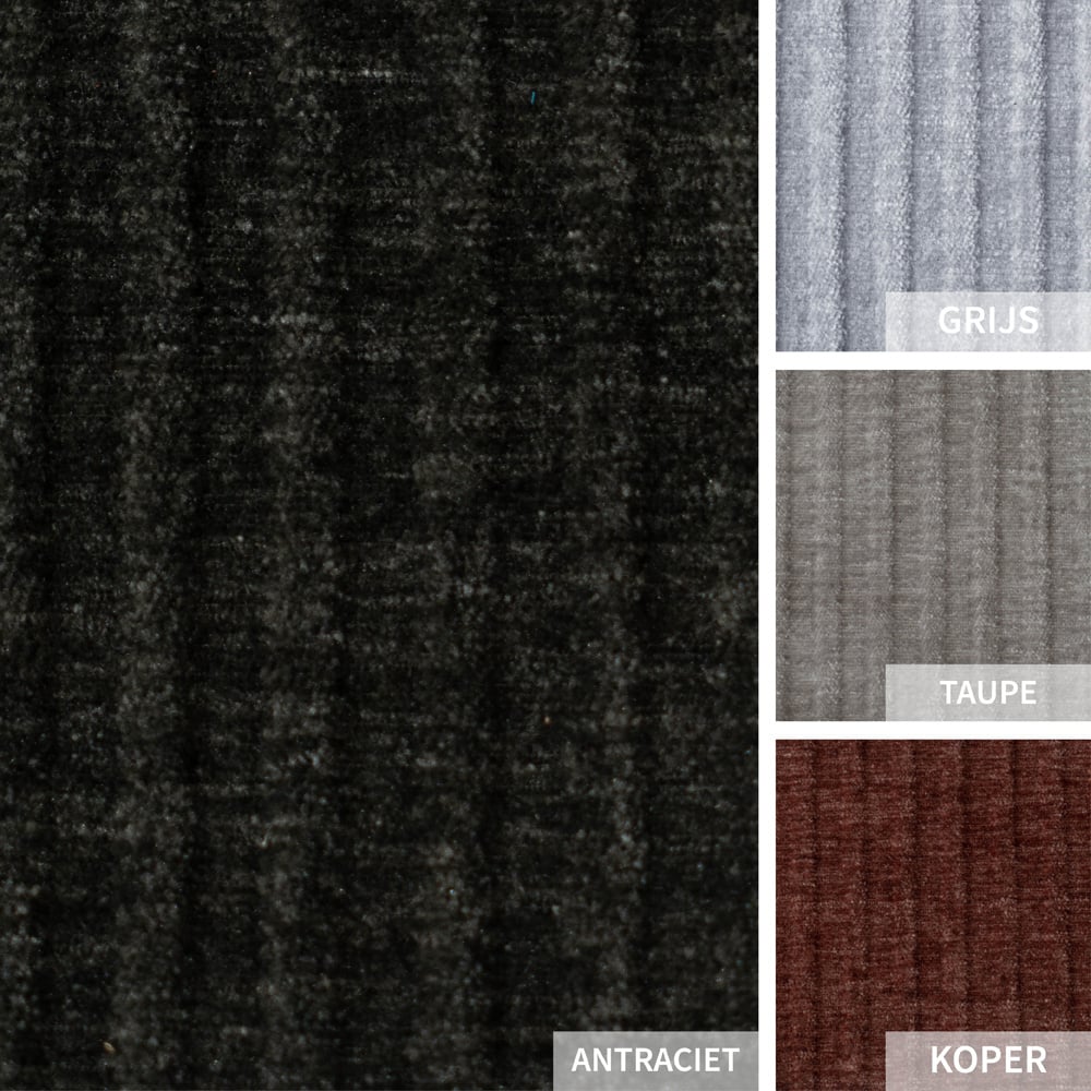 Deze Kansas bank is gemaakt van een zachte ribstof die bestaat uit 100% polyester. De stof heeft een Martindale score van 95.000. Dit betekent dat de stof zeer slijtvast is en erg lang mooi blijft. De ribstof heeft een wat dikkere streep dan de meeste ribstoffen. Daarnaast is de rib streep vrij plat, wat zorgt voor een luxe uitstraling. Tot slot voelt de stof lekker zacht aan. Dit maakt de bank nog extra comfortabel.