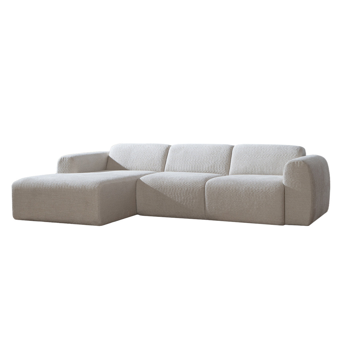 Hoekbank Maine is de perfecte balans tussen stijl en comfort, gemaakt van een fraaie bouclé stof. Dankzij het veelzijdige ontwerp past de Maine moeiteloos in verschillende interieurs.