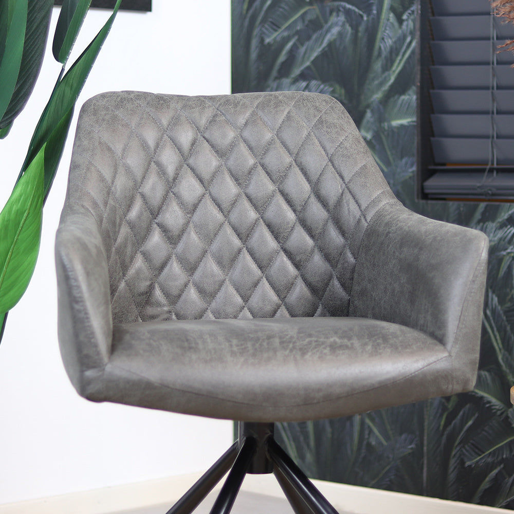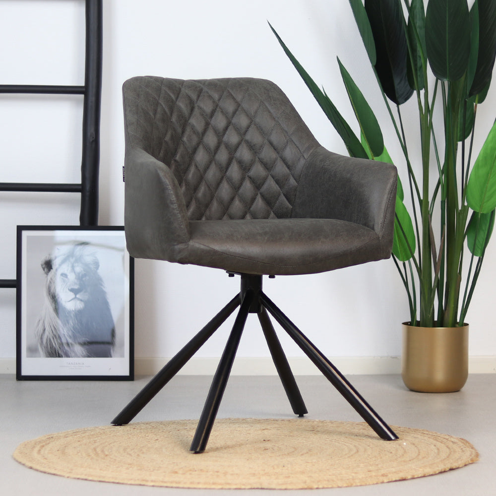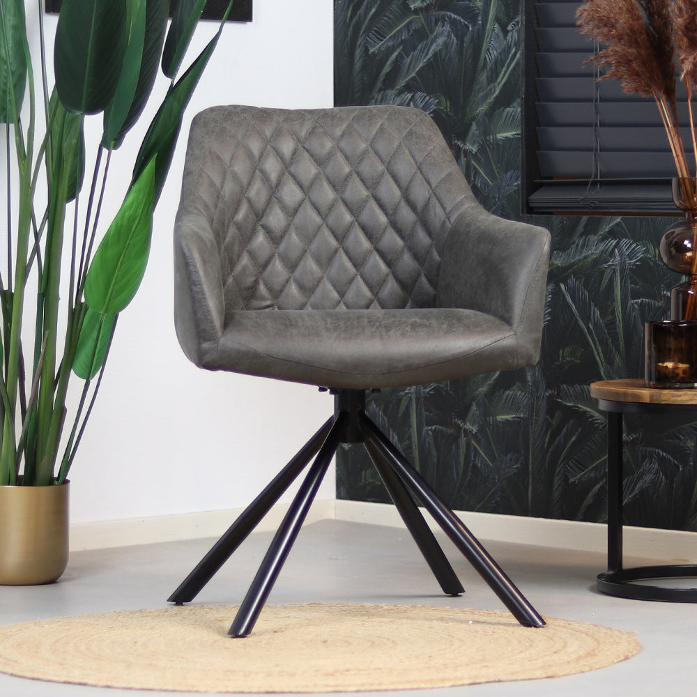 Industriële eetkamerstoel Dex heeft een stoer uiterlijk en past perfect in een industrieel interieur. Tevens past deze stoel door het strakke onderstel ook goed in een modern interieur! De zitting van de Dex is 180 graden draaibaar en zal altijd terugdraaien naar een rechte zit. Hierdoor staat de stoel altijd perfect aan de eetkamertafel! De zitting van eetkamerstoel Dex is afgewerkt met een mooi, diamantvormig patroon op de rugleuning. Hierdoor is het een echte eyecatcher.