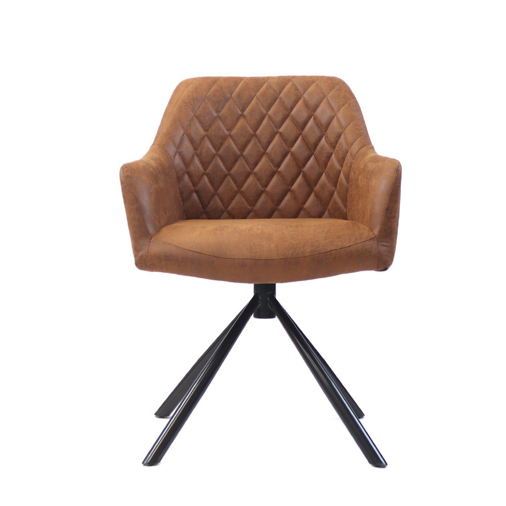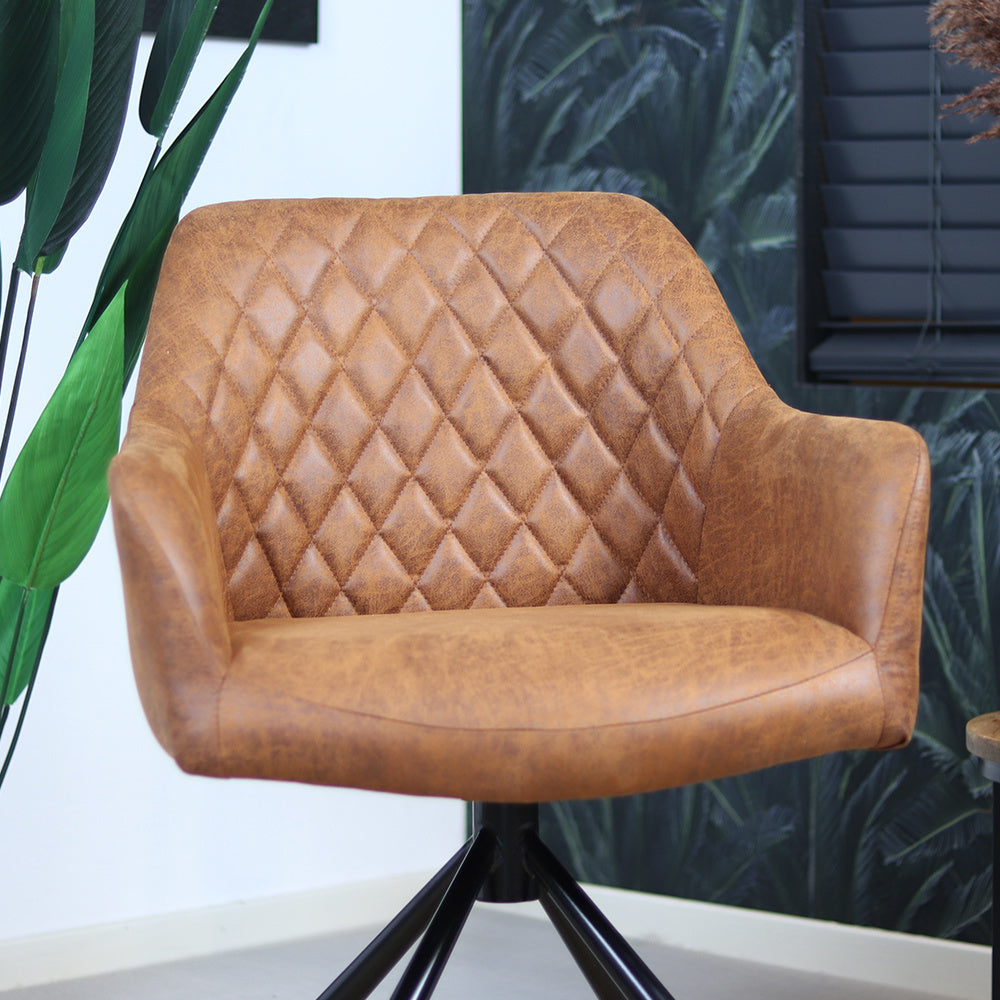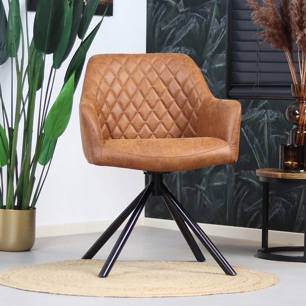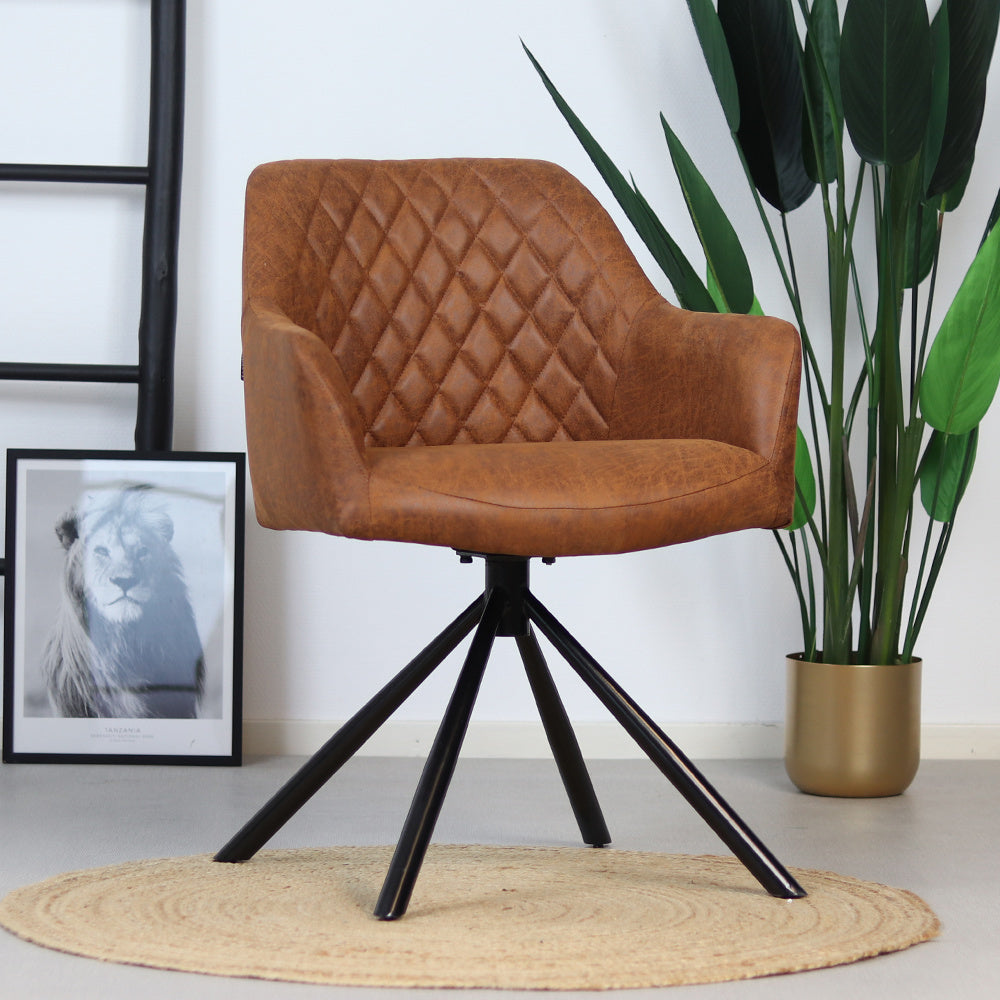 Industriële eetkamerstoel Dex heeft een stoer uiterlijk en past perfect in een industrieel interieur. Tevens past deze stoel door het strakke onderstel ook goed in een modern interieur! De zitting van de Dex is 180 graden draaibaar en zal altijd terugdraaien naar een rechte zit. Hierdoor staat de stoel altijd perfect aan de eetkamertafel! De zitting van eetkamerstoel Dex is afgewerkt met een mooi, diamantvormig patroon op de rugleuning. Hierdoor is het een echte eyecatcher.